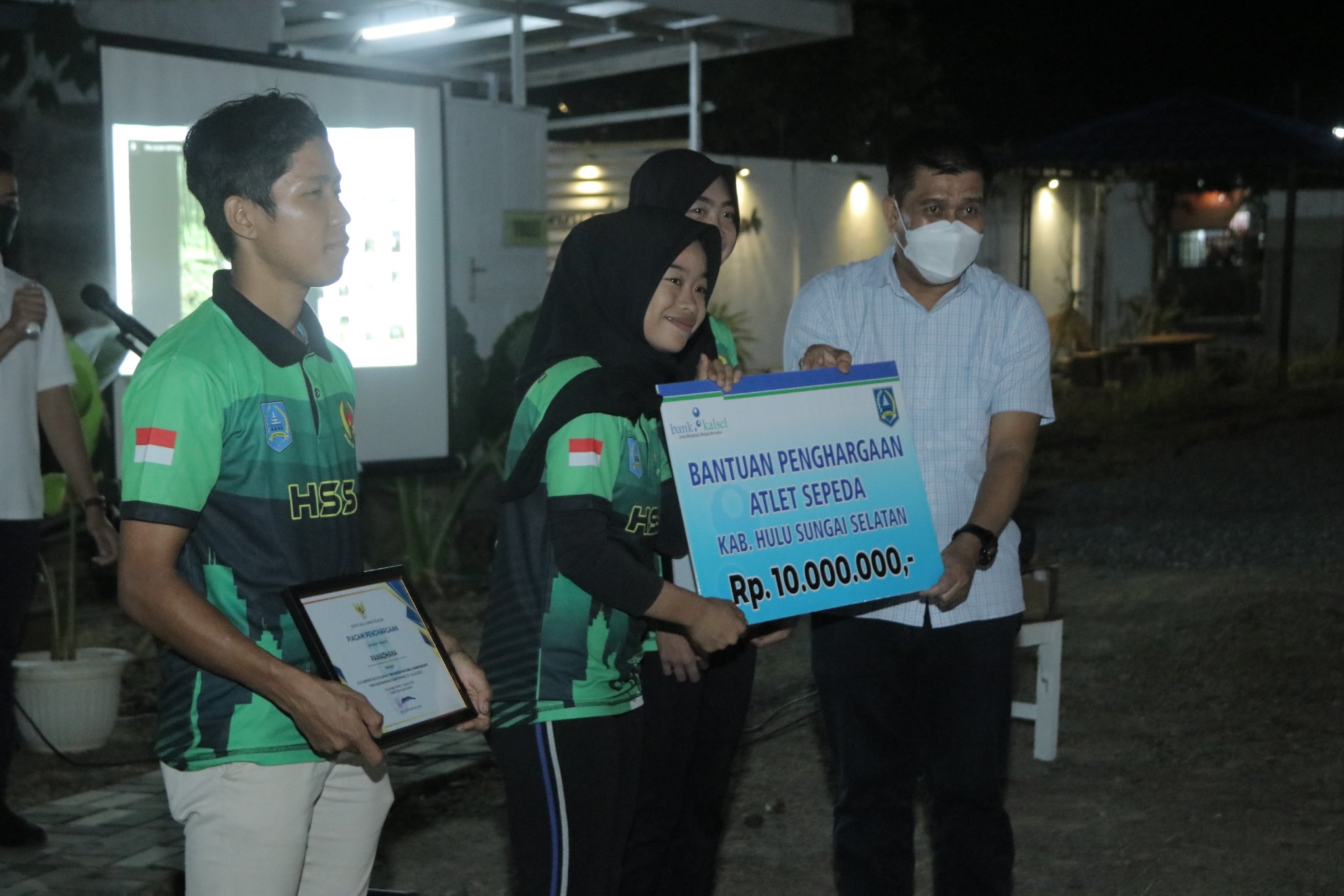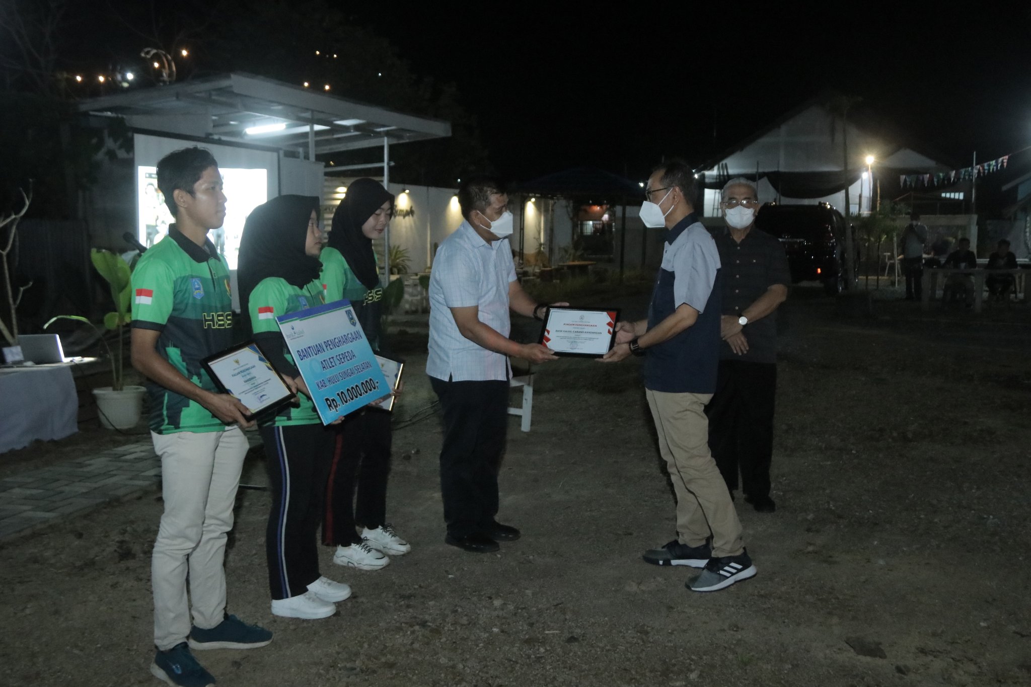 Bupati Hulu Sungai Selatan (HSS) Drs. H. Achmad Fikry, M.AP, bersama Sekretaris Daerah (Sekda) Kab. HSS Drs. Muhammad Noor, M.AP dan Kepala Bank Kalimantan Selatan (Kalsel) Cabang Kandangan menyerahkan Piagam Penghargaan kepada para atlet Ikatan Sport Sepeda Indonesia (ISSI) HSS yang berprestasi pada ajang Kejuaraan Nasional 2022 di Banyuwangi Jawa Timur. Penyerahan Piagam Penghargaan bertempat di Cafe Gugunungan Amandit. Senin Malam (08/08/202).