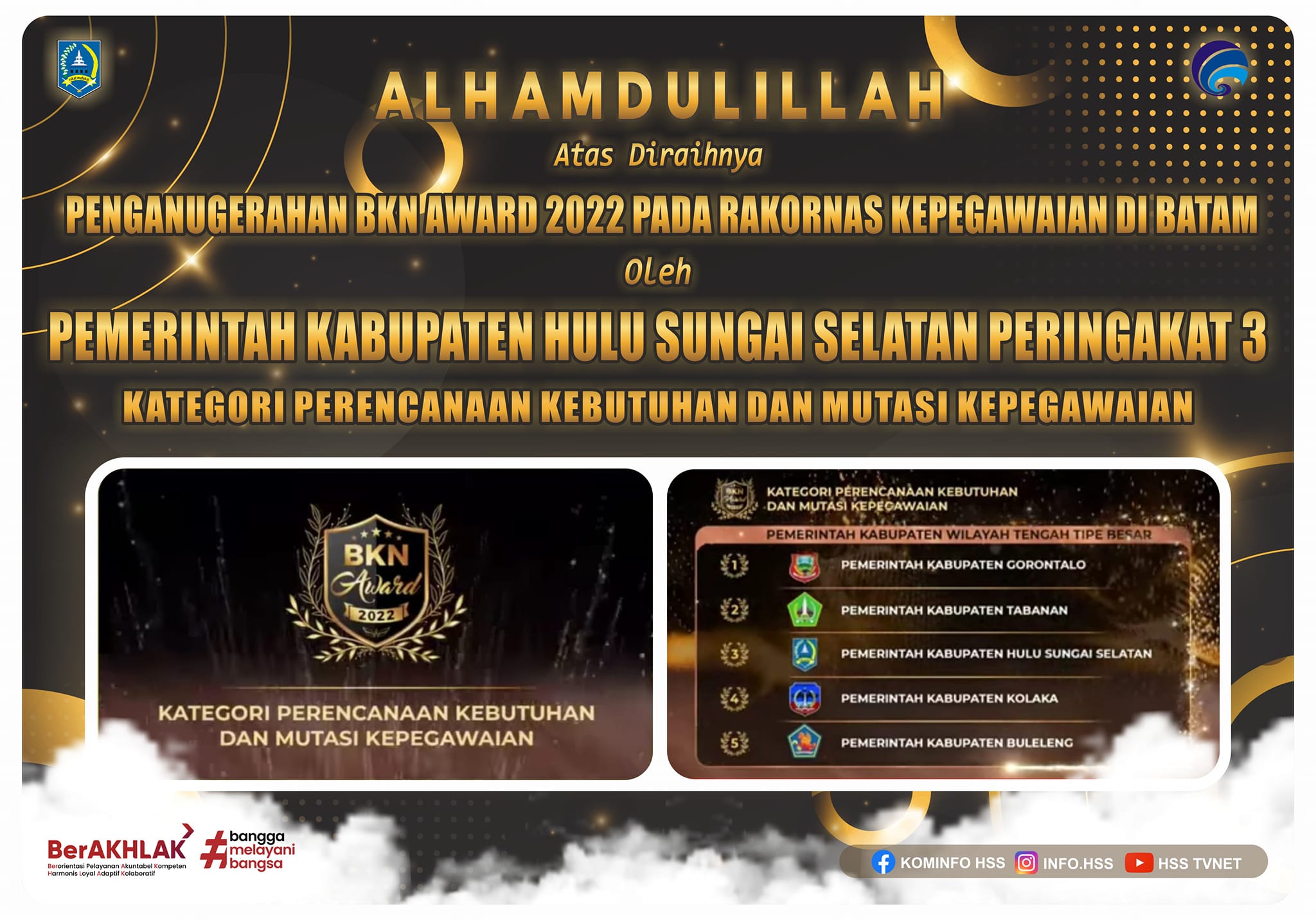 Alhamdulillah Atas Diraihnya Penganugerahan BKN Award 2022 Pada Rakornas Kepegawaian Di Batam Oleh Pemerintah Kabupaten Hulu Sungai Selatan Peringkat 3 Kategori Perencanaan Kebutuhan Dan Mutasi Kepegawaian