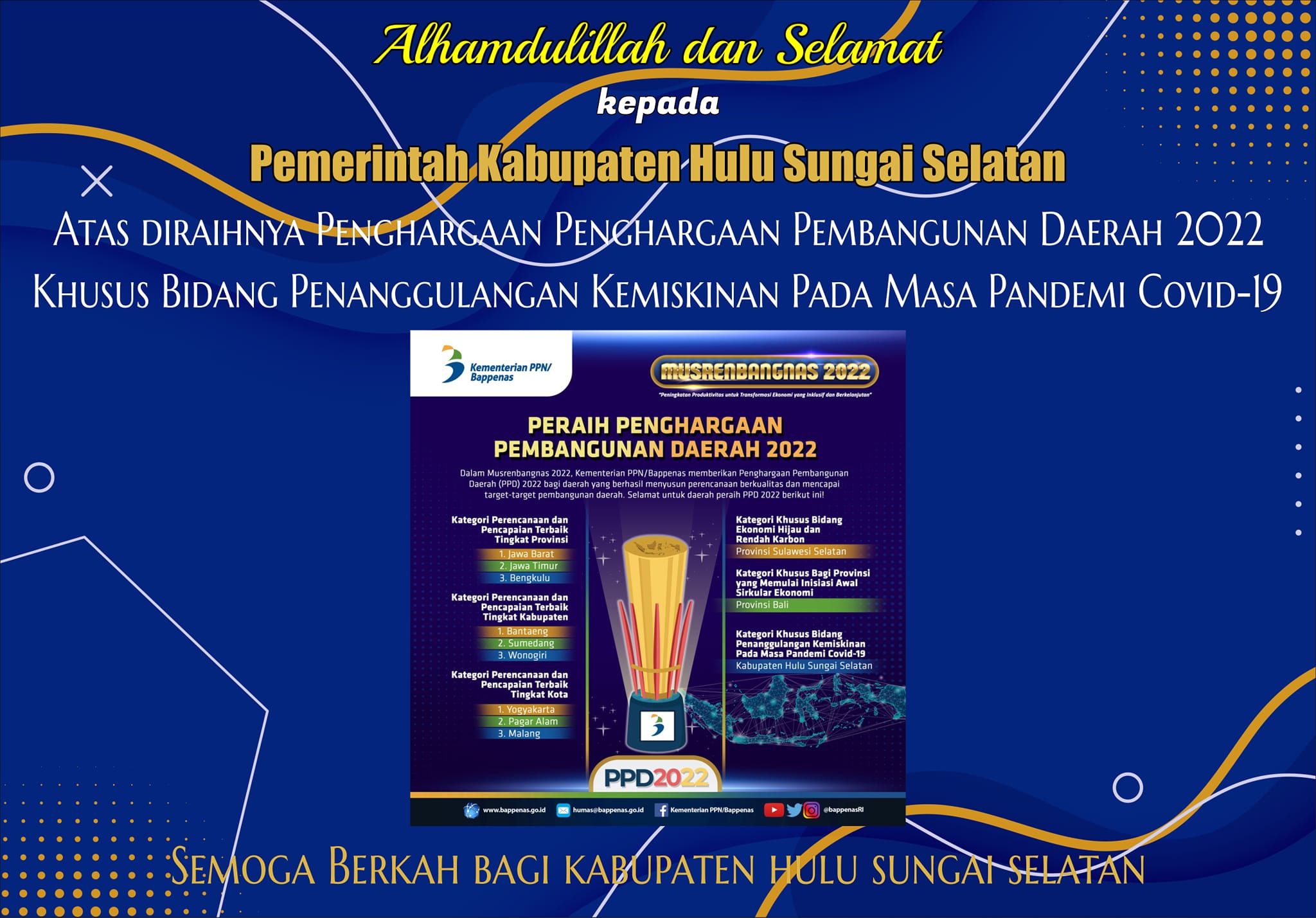 Semoga prestasi ini membawa keberkahan bagi Kabupaten Hulu Sungai Selatan <img class="aligncenter size-full wp-image-18211" src="https://pemkab.hulusungaiselatankab.go.id/wp-content/uploads/2022/05/278876817_1111340719414712_6963650672067748877_n.jpg" alt="" width="1080" height="607" />