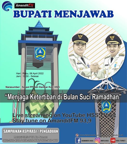 Assalamu’alaikum SanaKominfo! Masih pada semangat kan puasanya?😁 Program Bupati Menjawab edisi Ramadhan kita majukan ke pukul 13:30 yaa! Jangan sampai ketinggalan… Siang ini kita akan kedatangan narasumber dari Satpolpp Dan Damkar Kandangan dengan tema yang menarik untuk disimak tentunya😉