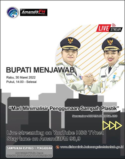 Assalamu’alaikum.. selamat siang SanaKominfo! Nantikan program kesayangan kita Bupati Menjawab pukul 14:00 siang ini, kita akan kedatangan narasumber dari Disperakplh Hss dengan tema “Mari Minimalisir Penggunaan Sampah Plastik” yang tentunya menarik sekali untuk disimak. Tonton melalui YouTube HSS TVnet dan radio AmanditFm yaa!