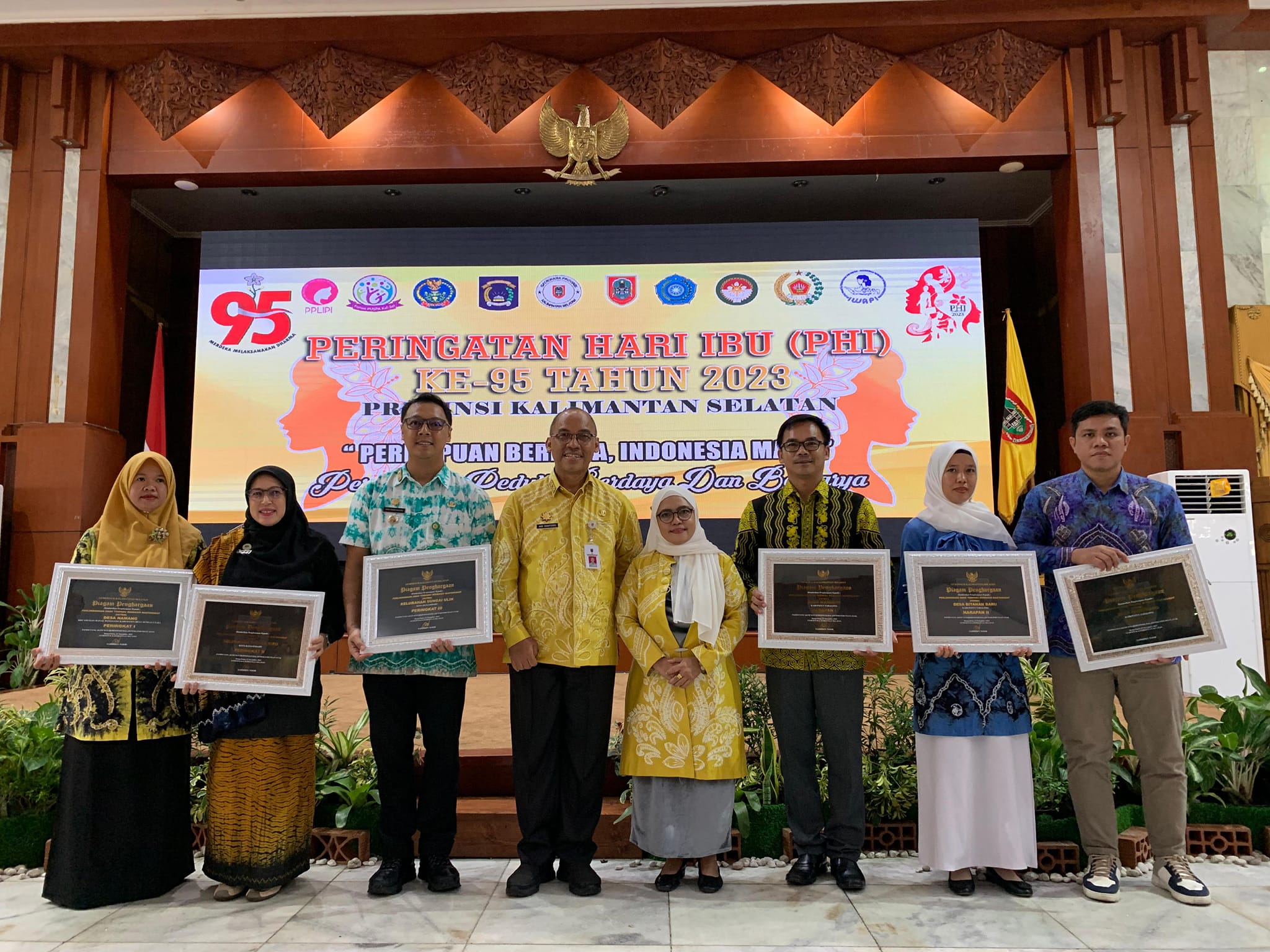 Pada Peringatan Hari Ibu (PHI) ke-95 Tahun 2023 Provinsi Kalimantan Selatan, Pj. Ketua TP. PKK Kabupaten Hulu Sungai Selatan Hj. Rusnawati Hermansyah menerimakan penghargaan Peningkatan Kualitas Keluarga Daerah (PK2D) Terbaik Kategori Utama pada Kabupaten/Kota Provinsi Kalimantan Selatan Tahun 2023 yang dilaksanakan di Gedung Mahligai Pancasila, Banjarmasin. (14/12/2023)