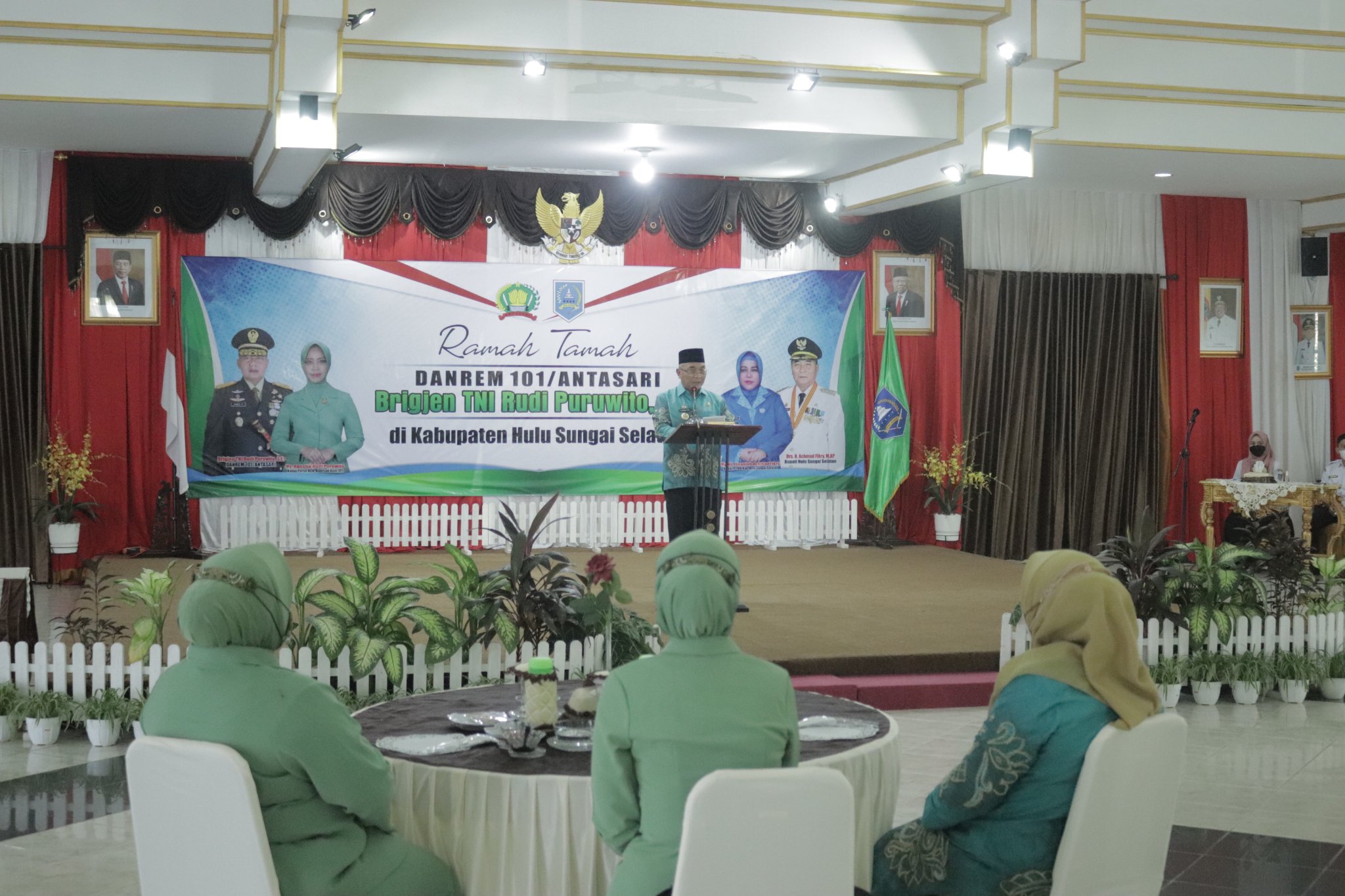 Dalam sambutannya Bupati HSS mengungkapkan rasa syukur dan bahagianya karena hari ini Danrem 101/Antasari beserta Ketua Persit Chandra Kirana Korem 101/Antasari bisa berkunjung ke Kabupaten HSS.