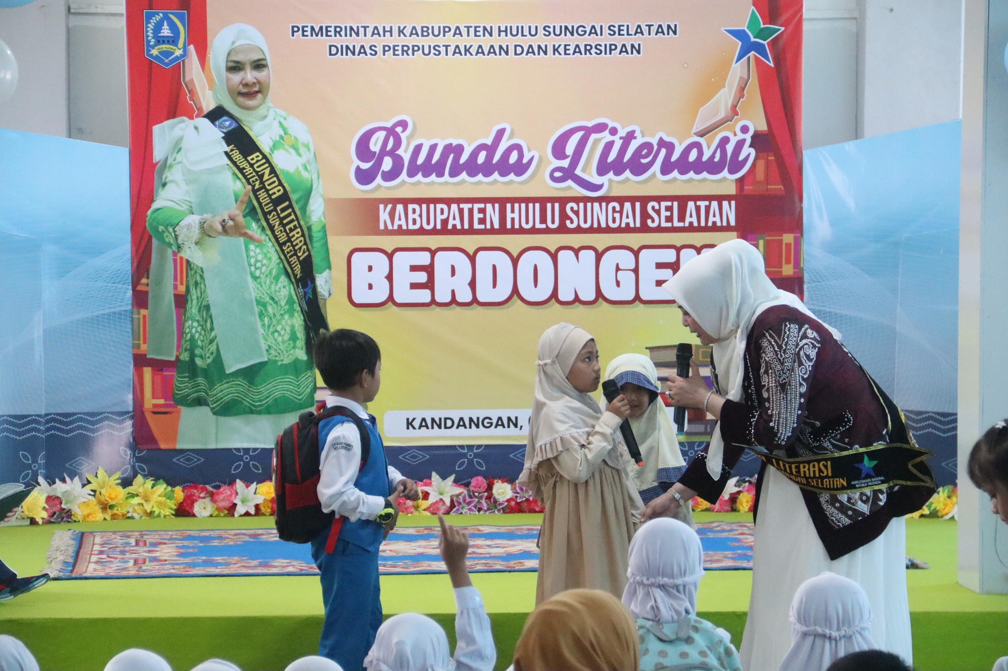 Dalam upaya menumbuhkan minat baca sejak usia dini, Bunda Literasi Kabupaten Hulu Sungai Selatan (Kab. HSS) Hj. Tata Syafrudin Noor bersama Dinas Perpustakaan dan Kearsipan (Dispersip Kab. HSS) menggelar kegiatan mendongeng untuk puluhan anak PAUD dan TK. Acara ini dilaksanakan di Aula Dispersip Kab. HSS pada Senin (06/10).