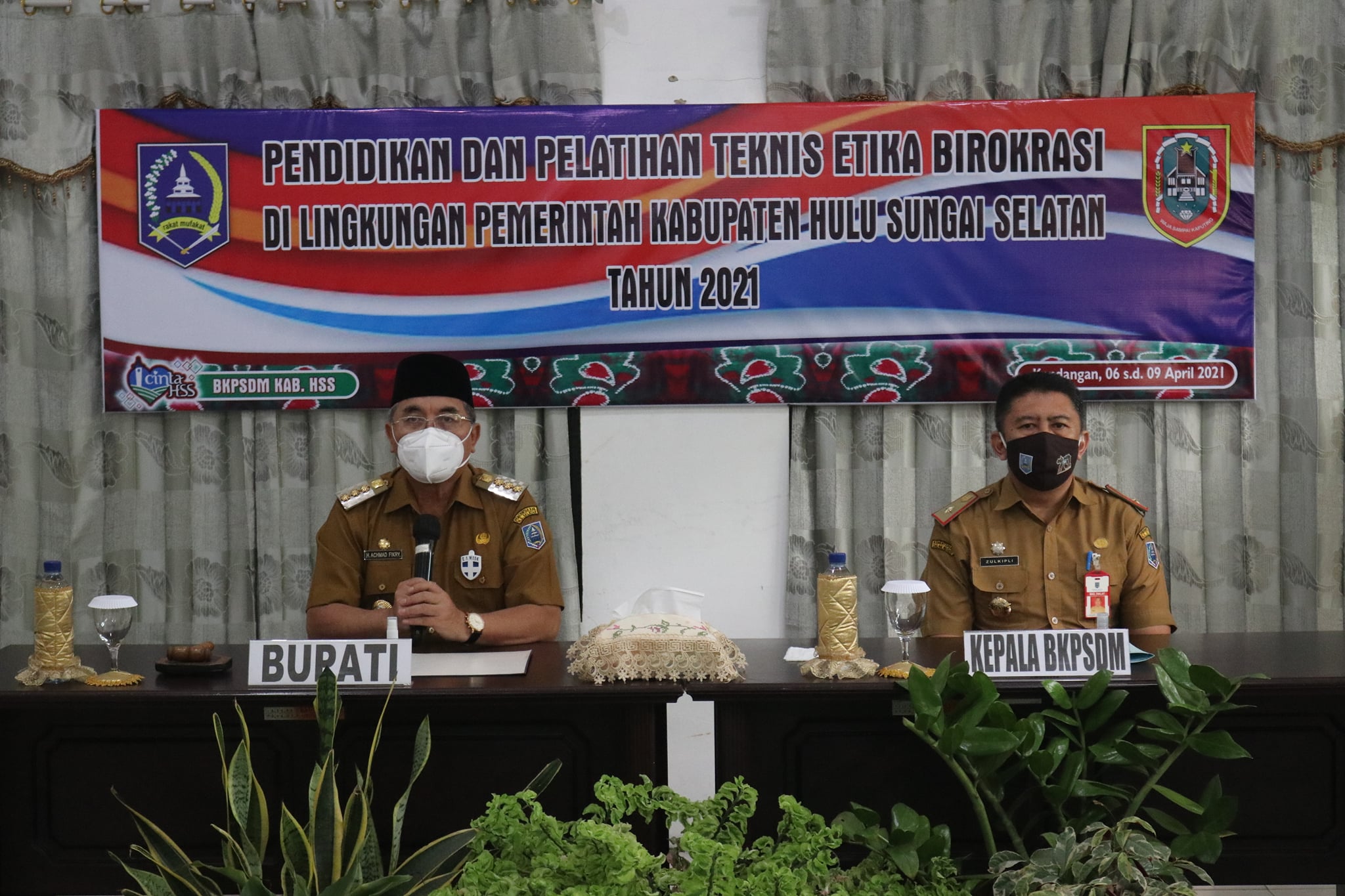 Bupati Hulu Sungai Selatan Drs. H. Achmad Fikry, M. AP didampingi Kepala Badan Kepegawaian dan Pengembangan Sumber Daya Manusia (BKPSDM) Kab. HSS H. Zulkifli S.Sos M.AP membuka secara resmi Pendidikan dan Pelatihan (Diklat) Teknis Etika Birokrasi Lingkup Pemerintah Kabupaten Hulu Sungai Selatan yang berlangsung di Gedung II BKD Diklat, Selasa (06/04/2021).