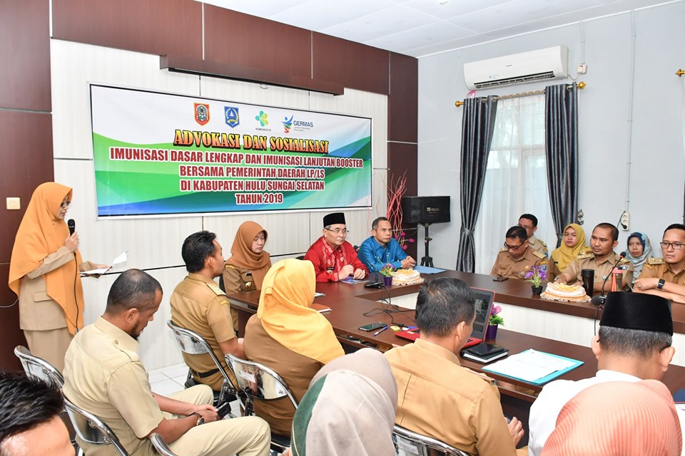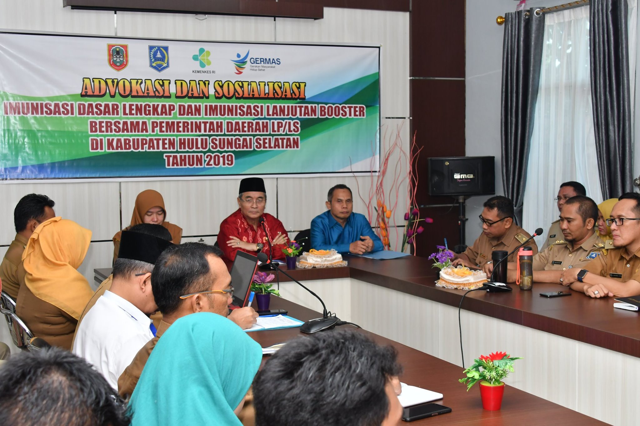 Dinas Kesehatan Kabupaten Hulu Sungai Selatan (HSS) menggelar Advokasi dan Sosialisasi Imunisasi Dasar Lengkap dan Imunisasi Lanjutan Booster Bersama Pemerintah Daerah LP/LS di Kabupaten Hulu Sungai Selatan tahun 2019. Kegiatan tersebut berlangsung pada Selasa (10/9/2019), bertempat di Aula Dinas Kesehatan. Hadir dalam kegiatan ini, Bupati HSS, Drs. H. Achmad Fikry, M.AP, Kepala Bidang Farmasi dan SDK Dinas Kesehatan Provinsi Kalimantan Selatan, Drs. H. Ahmad Yani, M.Si, Apt beserta rombongan, Kepala Dinas Kesehatan, dr.Hj Siti Zainab beserta jajaran, dan para peserta sosialisasi yang terdiri dari SKPD terkait, perwakilan TP PKK Kabupaten HSS, perwakilan MUI Kabupaten HSS, para Camat se Kabupaten HSS, para Kepala Puskesmas se Kabupaten HSS, Koordinator Imunisasi Puskesmas, dan Lintas Program Dinas Kesehatan.