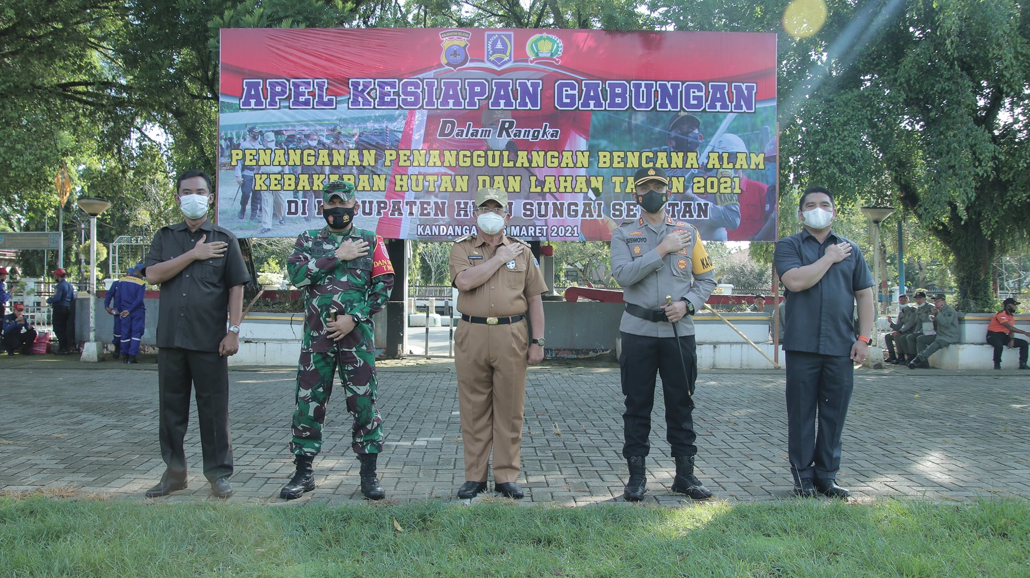 Bupati Hulu Sungai Selatan Drs. H. Achmad Fikry, M.AP menjadi Pembina Apel Kesiapan Gabungan dalam rangka Penanganan dan Penanggulangan Bencana Alam Kebakaran Hutan dan Lahan (Karhutla) Tahun 2021 di Kabupaten Hulu Sungai Selatan yang berlangsung diLapangan Lambung Mangkurat, Senin(15/03/2021).