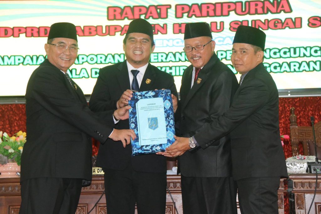 Selesai pidato pengantar, Bupati menyerahkan Buku Laporan Pertanggung Jawaban kepada Ketua DPRD H. Ahmad Fahmi yang didampingi para pimpinan DPRD. Selanjutnya laporan ini akan dibahas oleh seluruh anggota DPRD dalam tahapan rapat dan sidang berikutnya. Rapat Paripurna kali ini juga dihadiri seluruh unsur Forkopimda lengkap, Pejabat Sekda Drs. H. Huberiansyah, M.AP, Asisten, Para Kepala OPD dan Camat se-Kabupaten HSS.