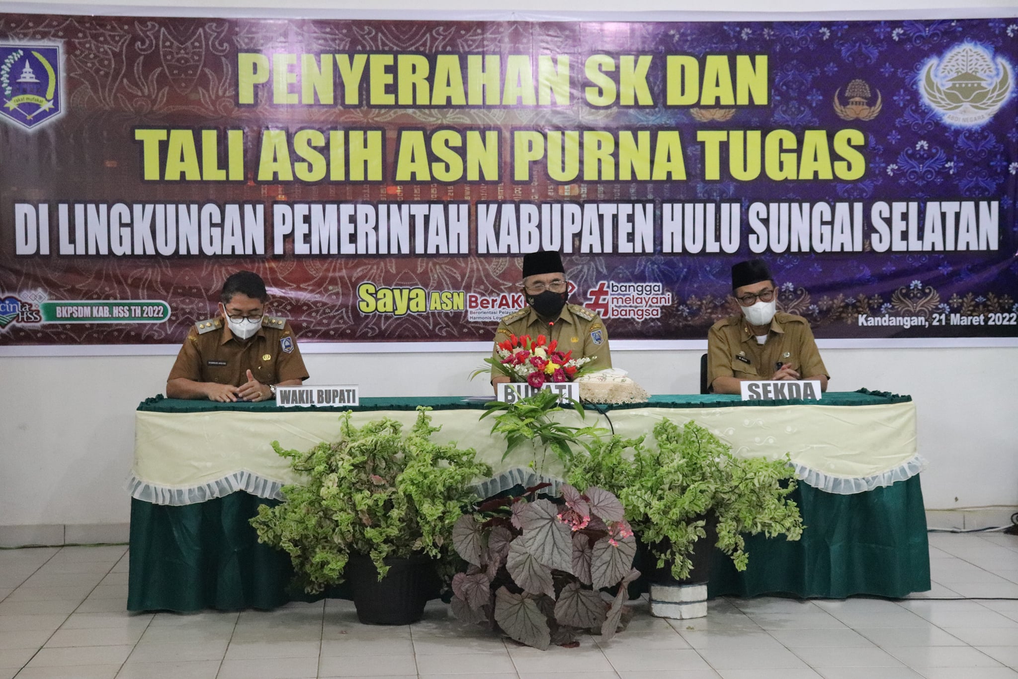 Pemerintah Kabupaten Hulu Sungai Selatan (Kab. HSS) melalui Badan Kepegawaian dan Pengembangan Sumber Daya Manusia (BKPSDM) Kab. HSS kerjasama dengan Korps Persatuan Pegawai Republik Indonesia (KORPRI) Kab. HSS menyerahkan tali asih bagi Aparatur Sipil Negara (ASN) yang memasuki masa purna tugas terhitung dari tanggal 1 Januari – 1 April 2022.