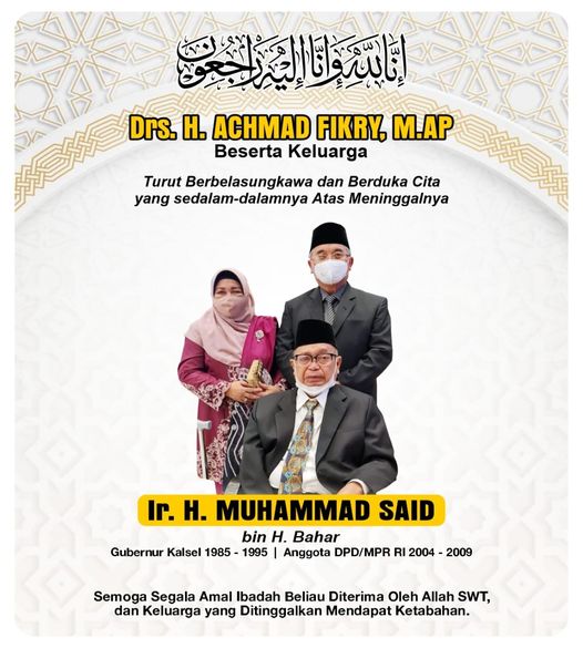 Bupati Hulu Sungai Selatan Drs. H. Achmad Fikry, M.AP beserta Keluarga mengucapkan belasungkawa yang sedalam-dalamnya dan turut berduka cita atas meninggalnya : Ir. H. Muhammad Said bin H. Bahar (Gubernur Kalsel 1985-1995 dan Anggota DPD/MPR RI 2004-2009) *Meninggal Dunia : Rabu, 15 Rajab 1443 H / 16 Februari 2022 M. Jam : 05.15 WIB. Semoga segala amal ibadah beliau diterima oleh Allah SWT dan keluarga yang ditinggalkan mendapat ketabahan.