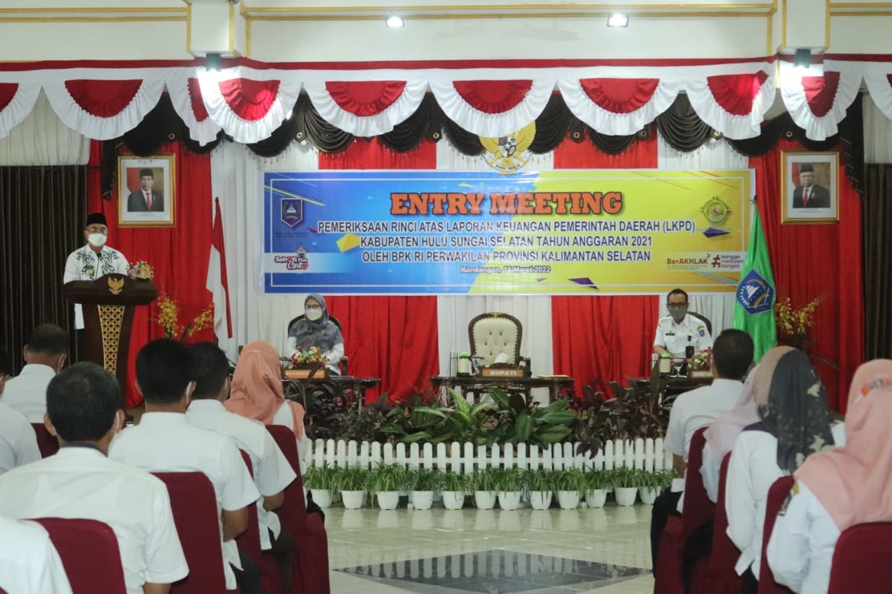 Bupati Hulu Sungai Selatan Drs. H. Achmad Fikry, M.AP membuka acara Entry Meeting Pemeriksaan Rinci atas Laporan Keuangan Pemerintah Daerah (LKPD) Kabupaten Hulu Sungai Selatan Tahun Anggaran (TA) 2021 oleh BPK RI Perwakilan Provinsi Kalimantan Selatan, yang dilaksanakan di Pendopo Bupati, Rabu (16/03/2022).Membuka sambutannya, Bupati HSS mengucapkan selamat datang kepada Tim Badan Pemeriksa Keuangan Perwakilan Provinsi Kalimantan Selatan yang akan bertugas di Hulu Sungai Selatan. Lebih lanjut, selaku pemegang kekuasaan Pengelolaan Keuangan Daerah, beliau melaporkan kepada tim audit BPK bahwa semua Perangkat Daerah di Kab. HSS telah menyampaikan laporan keuangannya masing-masing namun dikatakannnya dalam pemeriksaan tentu dibutuhkan komunikasi yang lebih intens dari pemeriksa dan semua Perangkat Daerah (PD).Sementara itu, guna mendorong kelancaran tugas pokok tim audit BPK, Bupati HSS juga mengarahakan semua PD agar tetap berada di daerah dan tidak di perkenankan keluar daerah tanpa seizinnya. menurutnya hal tersebut penting dilakukan agar sinergi antara pemerintah daerah sebagai objek yang diperiksa dan BPK dalam melaksanakan tugas pemeriksa dapat terjalin komunikasi yang baik. H. Achmad Fikry juga berharap semua PD dapat memberikan data dukung yang dibutuhkan agar dapat segera di berikan respon yang cepat terhadap permintaan kejelasan apa yang diminta oleh BPK RI.Turut hadir, Sekretaris Daerah Kab. HSS Drs. H. M. Noor, M.APA, para Asisten, Staf Ahli, Kepala PD, serta Camat.
