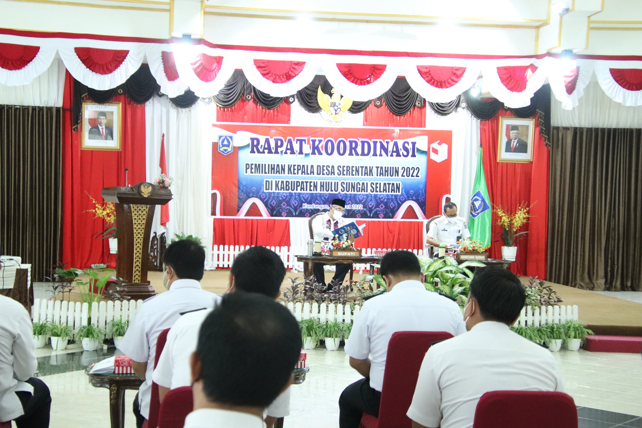 Bupati Hulu Sungai Selatan (HSS) Drs. H. Achmad Fikry, M.AP didampingi Sekretaris Daerah Kabupaten Hulu Sungai Selatan Drs. H. M. Noor, M.AP memimpin Rapat Koordinasi pemantapan Pemilihan Kepala Desa (Pilkades) serentak di 1029 desa pada 2 Juni 2022 mendatang, di Pendopo Bupati. Rabu (02/03).