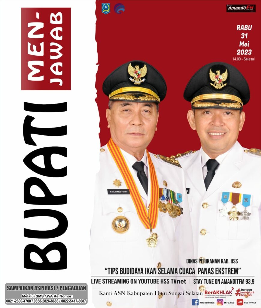 Program Bupati Menjawab pukul 14.00 siang hari ini kita akan kedatangan narasumber dari Dinas Perikanan Kab. HSS dengan mengusung tema “Tips Budidaya Ikan Selama Cuaca Panas Ekstrem” yang tentunya menarik untuk kita ketahui bersama.