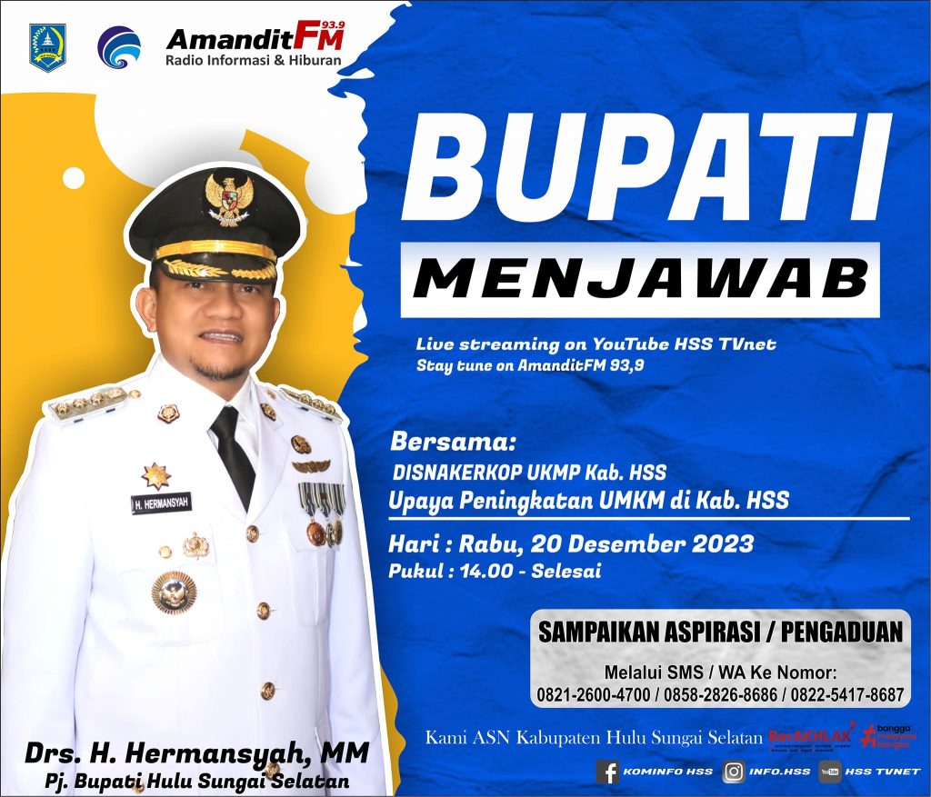 Program Bupati Menjawab Rabu, pukul 14.00 siang nanti kita akan kedatangan narasumber dari Disnakerkop UKMP Kab. HSS 📢