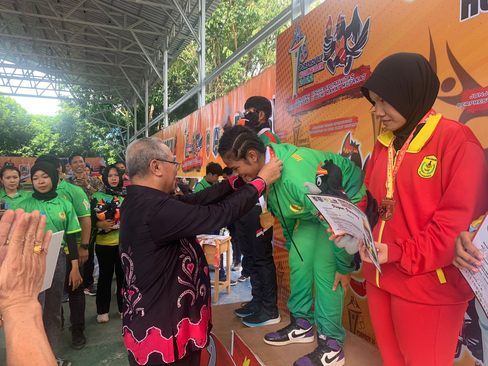 Pada kesempatan itu, Bupati HSS H. Achmad Fikry mengalungkan medali dan menyerahkan sertifikat kepada para pemenang dalam ajang pertandingan Cabor SAMBO, sedang untuk Kontingen HSS yang berhasil mendapat medali emas diberikan bonus voucher prestasi kepada atlet tersebut.