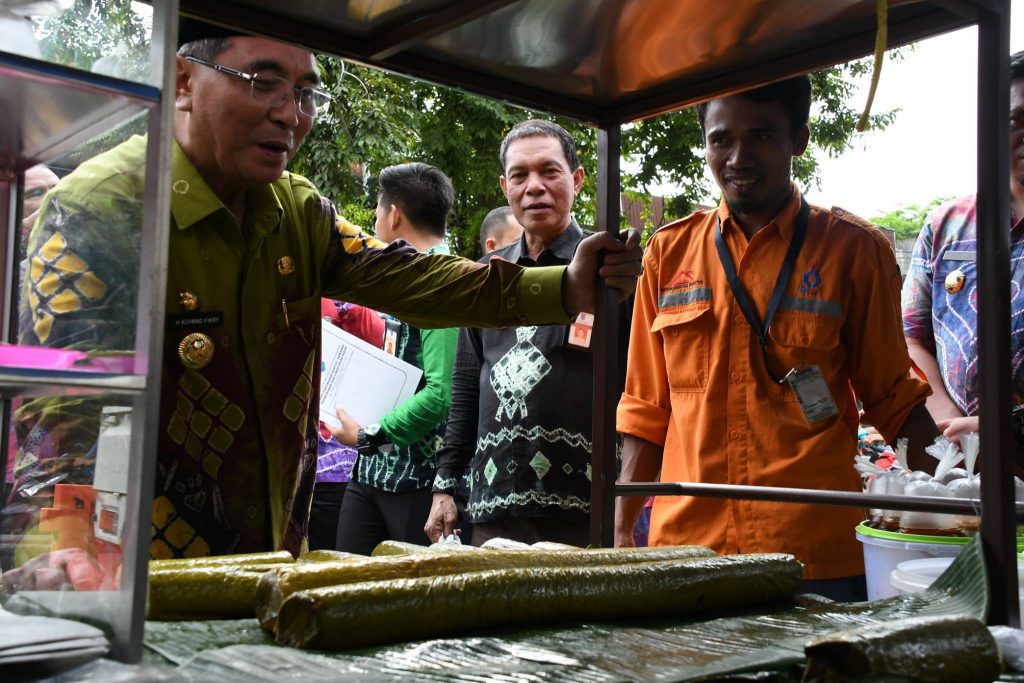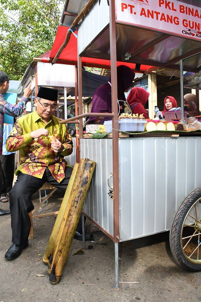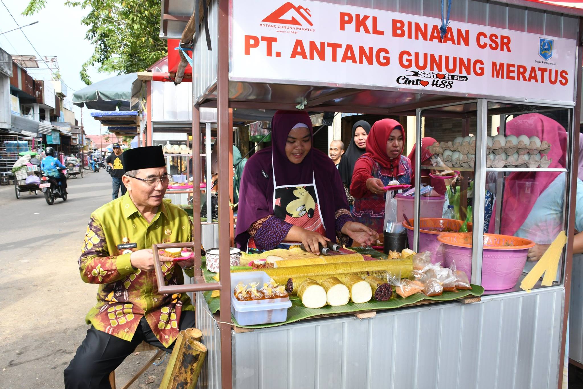 Dalam kesempatan ini H. Achmad Fikry juga menyempatkan diri untuk mencicipi kuliner ketan ini bersama dengan jajaran Dinas Perdagangan dan pihak PT. AGM. Sesekali dirinya berdialog dan bercanda dengan para pedagang lamang ini. Selain untuk para pedagang lamang bantuan yang sama juga diberikan kepada para pedagang buah yang ada di Jl. Pangeran Antasari berupa Rak Dagang Kepada para pedagang ini secara simbolis Bupati menyerahkan Surat Perjanjian Hibah untuk bantuan Gerobak dan Rak Dagang tersebut.