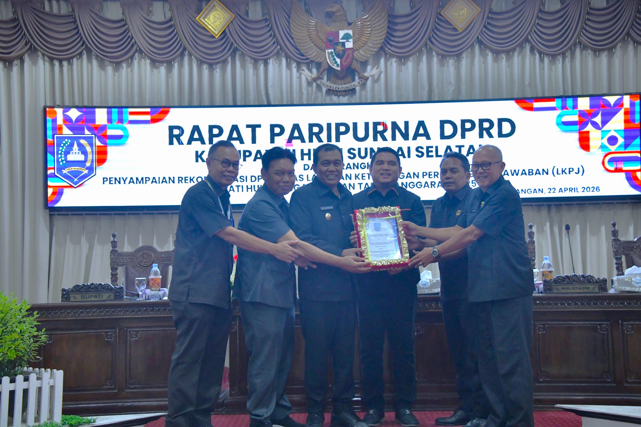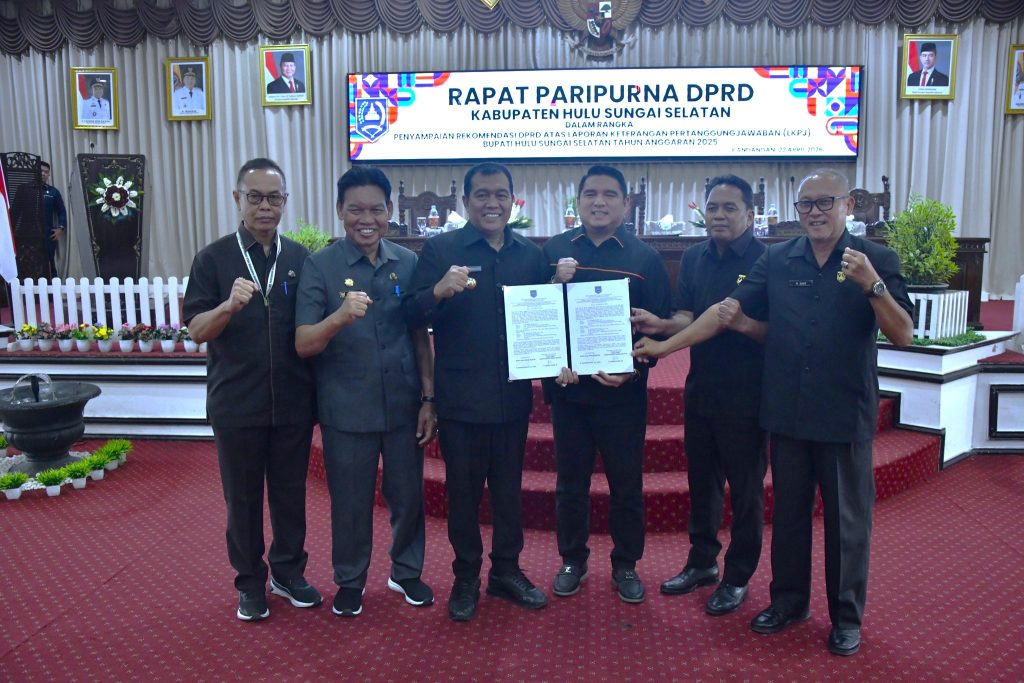 Bupati Hulu Sungai Selatan (HSS), H. Syafrudin Noor, SE., S.Sos menghadiri rapat paripurna Dewan Perwakilan Rakyat Daerah (DPRD) Kabupaten Hulu Sungai Selatan dengan agenda penyampaian rekomendasi DPRD terhadap Laporan Keterangan Pertanggungjawaban (LKPJ) Bupati Tahun Anggaran 2025. Rapat berlangsung pada Rabu (22/04/2026) di ruang rapat lantai 2 Gedung DPRD HSS.