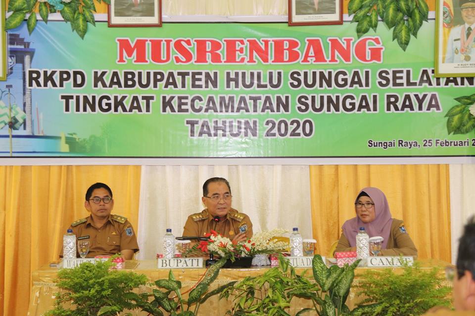 Bupati HSS Drs. H. Achmad Fikry M.Ap didampingi Wakil Bupati HSS Syamsuri Arsyad S.Ap MA membuka secara resmi Musrenbang RKPD tahun 2020 Kec. Sungai Raya, Senin (25/02).