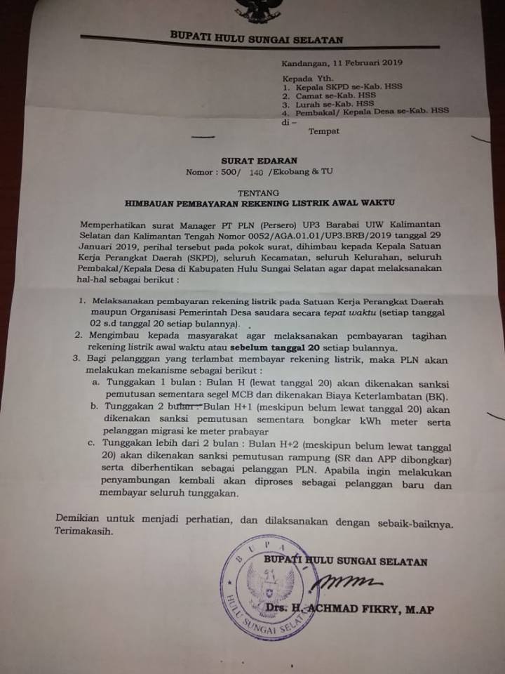 Memperhatikan surat Manager PT PLN (Persero) UP3 Barabai UIW Kalimantan Selatan dan Kalimantan Tengah Nomor 0052/AGA.01.01/UP3.BRB/2019 tanggal 29 Januari 2019, perihal tersebut pada surat, dihimbau kepada Kepala Satuan kerja Perangkat Daerah (SKPD), seluruh Kecamatan, seluruh Kelurahan, seluruh Pembakal/Kepala Desa di Kabupaten Hulu Sungai Selatan agar dapat melaksanakan hal-hal sebagai berikut :