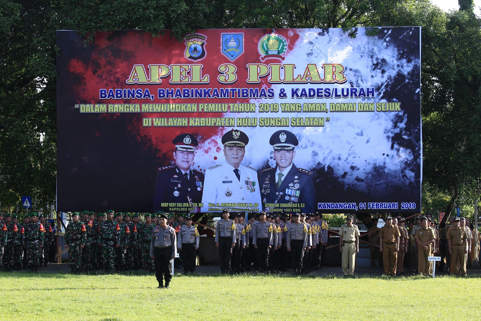 Apel tiga pilar keamanan dan ketertiban masyarakat (kamtibmas) di Kabupaten Hulu Sungai Selatan(HSS) menyelenggarakan apel besar dalam rangka menyukseskan Pilpres dan Pileg 2019, Acara tersebut dihadiri langsung Bupati HSS Drs.H.Achmad Fikry,M.AP didampingi Wakil Bupati HSS Syamsuri Arsyad,S.AP,MA, Ketua DPRD Kab.HSS H.Akhmad Fahmi,SE, Dandim 1003 Kandangan Letkol.Inf.Suhardi Aji S, SE, Kapolres HSS AKBP Dedy Eka Jaya, Sik,SH dan jajaran Forkopimda, para kepala SOPD kab.HSS serta seluruh peserta apel, bertempat di lapangan Lambung Mangkurat HSS, Jumat 1/02/2019.