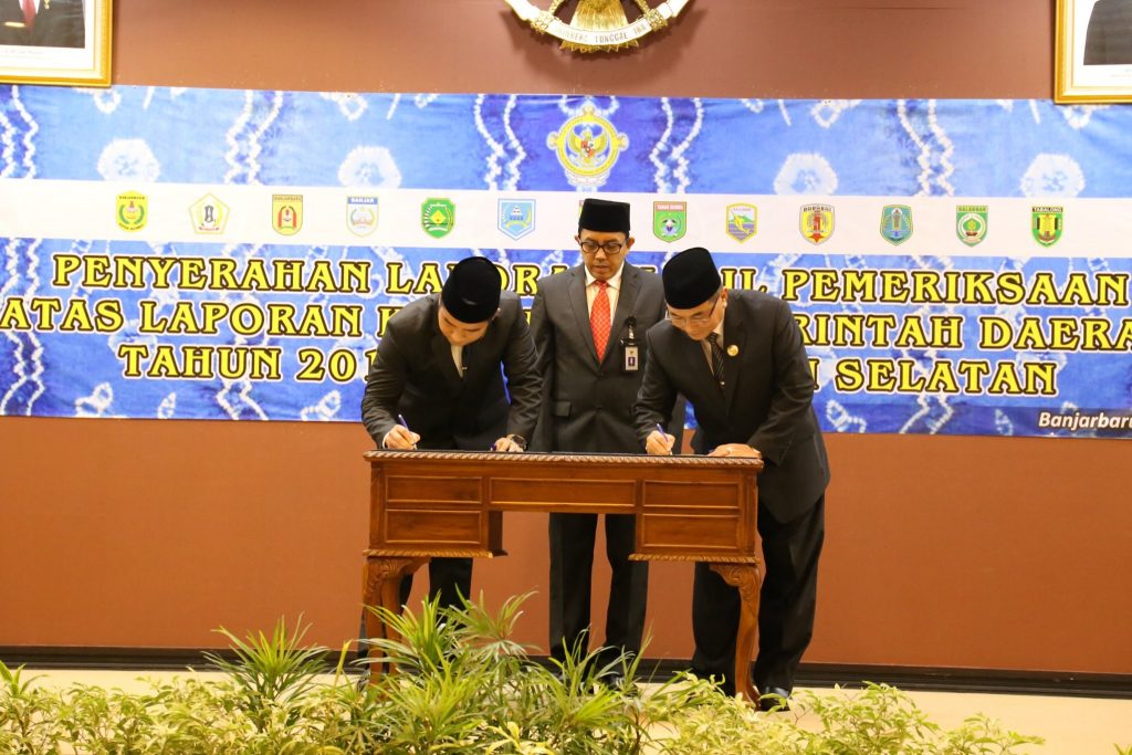 Bupati HSS Drs.H.Achmad Fikry.M.AP menerima hasil pemeriksaan LKPD Tahun Anggaran 2018 yang diserahkan oleh Kepala Perwakilan Badan Pemeriksa Keuangan (BPK) Provinsi Kalimantan Selatan (Kalsel) Tornanda Syaifullah.