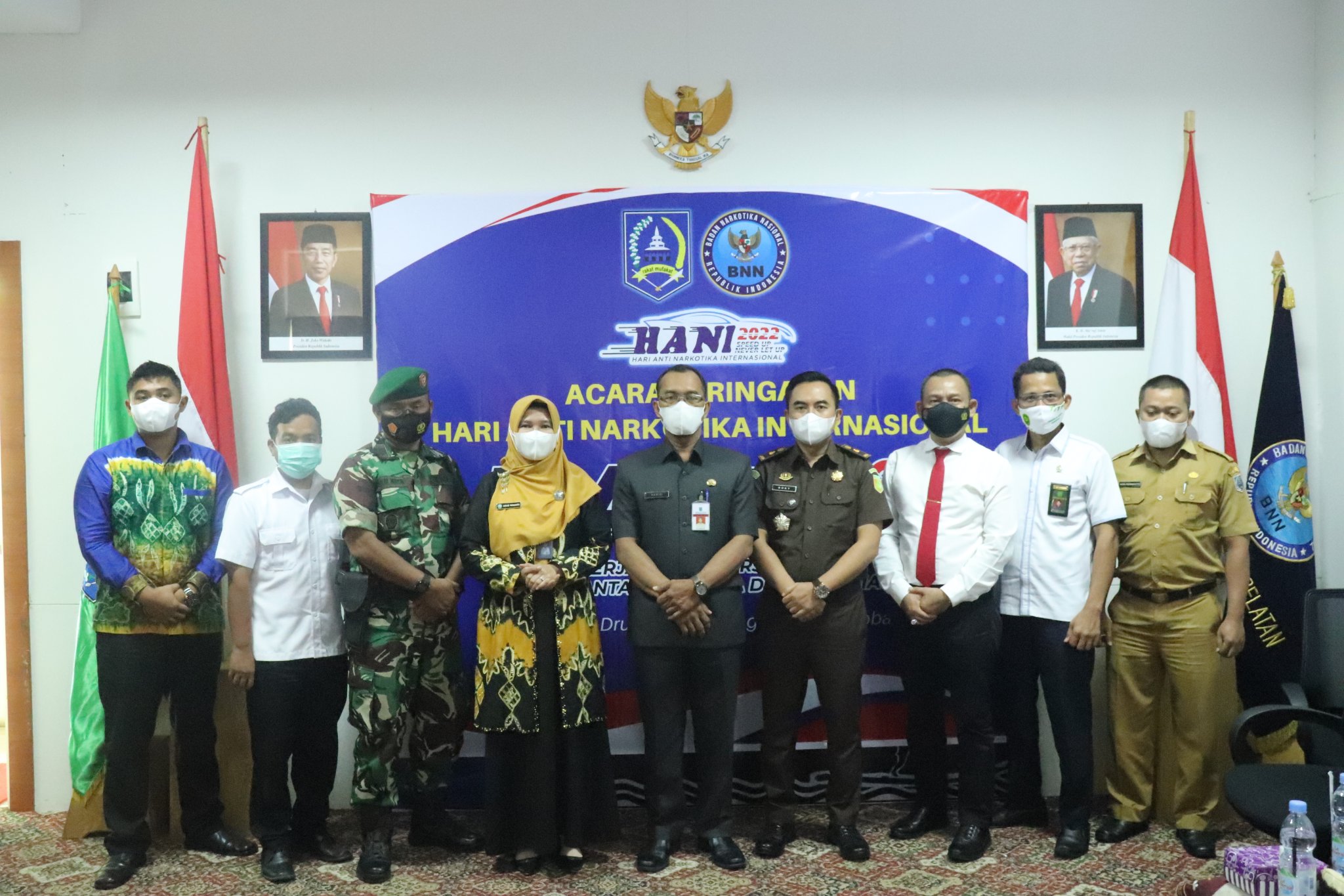 Dengan semangat untuk memerangi tindak penyalahgunaan narkoba, pagi ini Pemerintah Kabupaten Hulu Sungai Selatan (HSS) yang diwakili Asisten Pemerintahan dan Kesra Setda Kab. HSS Drs. Kamidi, M.IP bersama Forkopimda dan Kepala BNNK HSS Agus Winarti, S.KM, M.PH serta beberapa orang perwakilan Desa Bersinar (Bersih Narkoba) Kab. HSS mengikuti Puncak Peringatan Hari Anti Narkotika Internasional (HANI) Tahun 2022. Bertempat di ruang Media Center Setda HSS. Pada Senin, (27/02/2022).