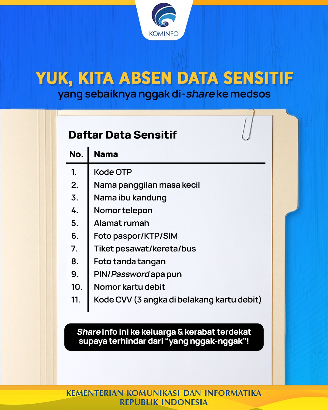Minfo nggak akan bosen-bosen deh ngingetin #SobatKom semua untuk selalu menjaga data pribadi. Khususnya yang ada di daftar ini nih!
