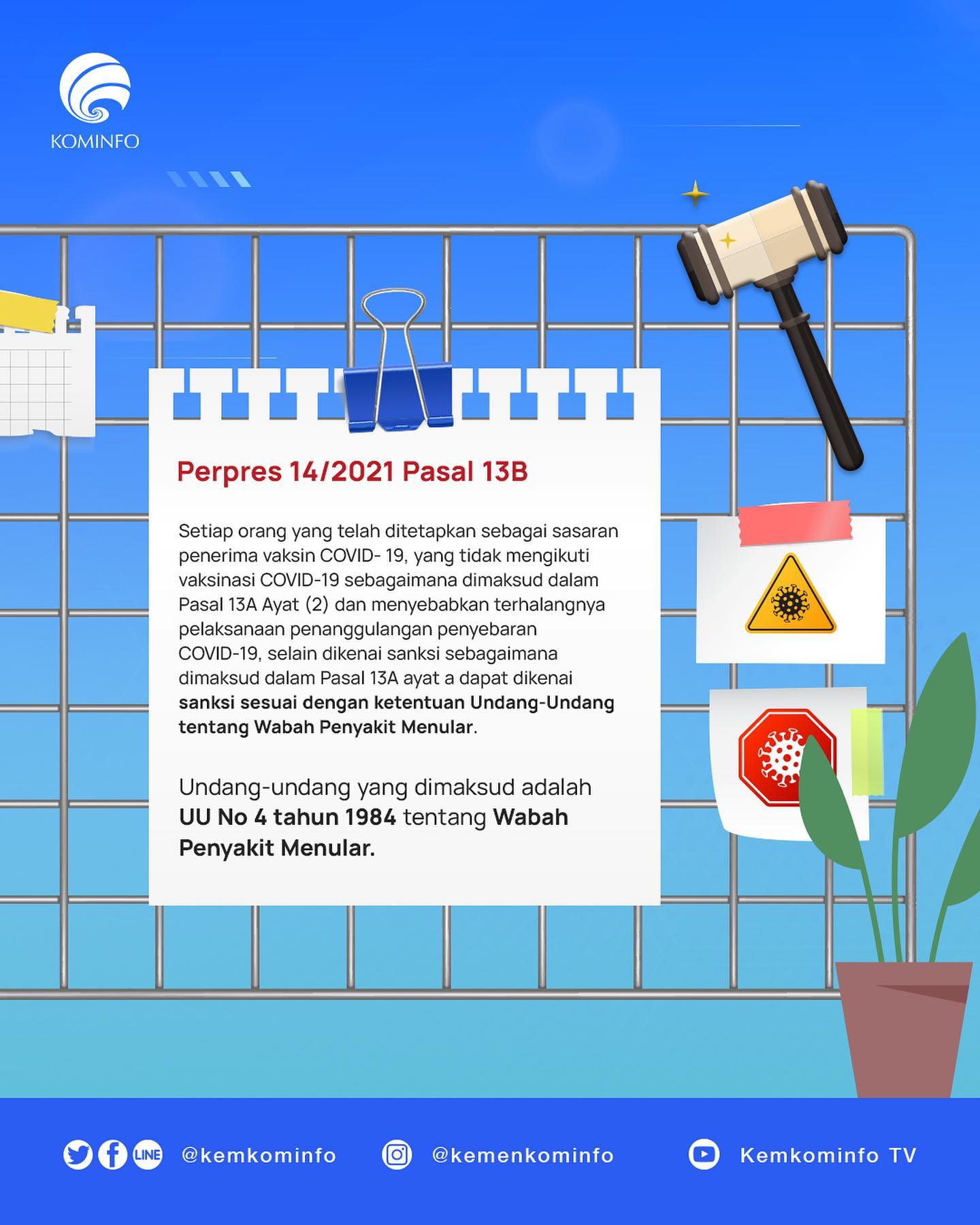 Pemerintah menargetkan vaksinasi COVID-19 terhadap 181,5 juta penduduk Indonesia untuk menciptakan herd immunity. Perpres Nomor 14 Tahun 2021 menjadi payung hukum jika seseorang yang telah ditetapkan sebagai sasaran menolak proses vaksinasi ini.