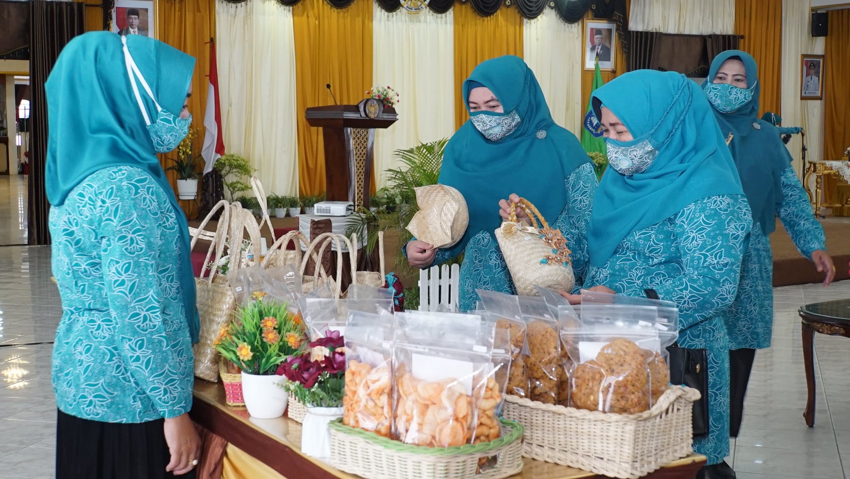 Ketua TP. PKK Kab. HSS Hj. Isnaniah bersama Wakil Ketua I Srie Astuti, Wakil Ketua II Hj. Elyani Yustika, serta pengurus PKK Kabupaten memantau, menyaksikan, serta berbincang dengan peserta lomba.