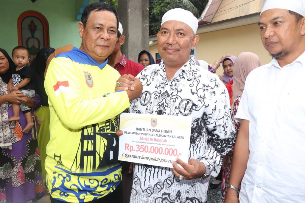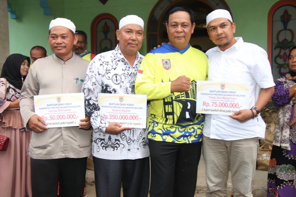 Pada kesempatan ini Gubernur Kalsel yang akrab dipanggil Paman Birin ini juga secara simbolis menyerahkan bantuan dana hibah Pemprov Kalsel untuk Mesjid Ar-Raudhah Kandangan sebesar Rp. 350.000.000, Rp. 75.000.00 untuk Ponpes Ibnu Mas’ud Putri Sungai Raya, dan Rp. 50.000.000 untuk Mushola Bihrul Jannah Desa Tumbukan Banyu Daha Selatan serta membagikan sembako kepada warga kurang mampu dan juga paket makanan tambahan sehat untuk Balita.