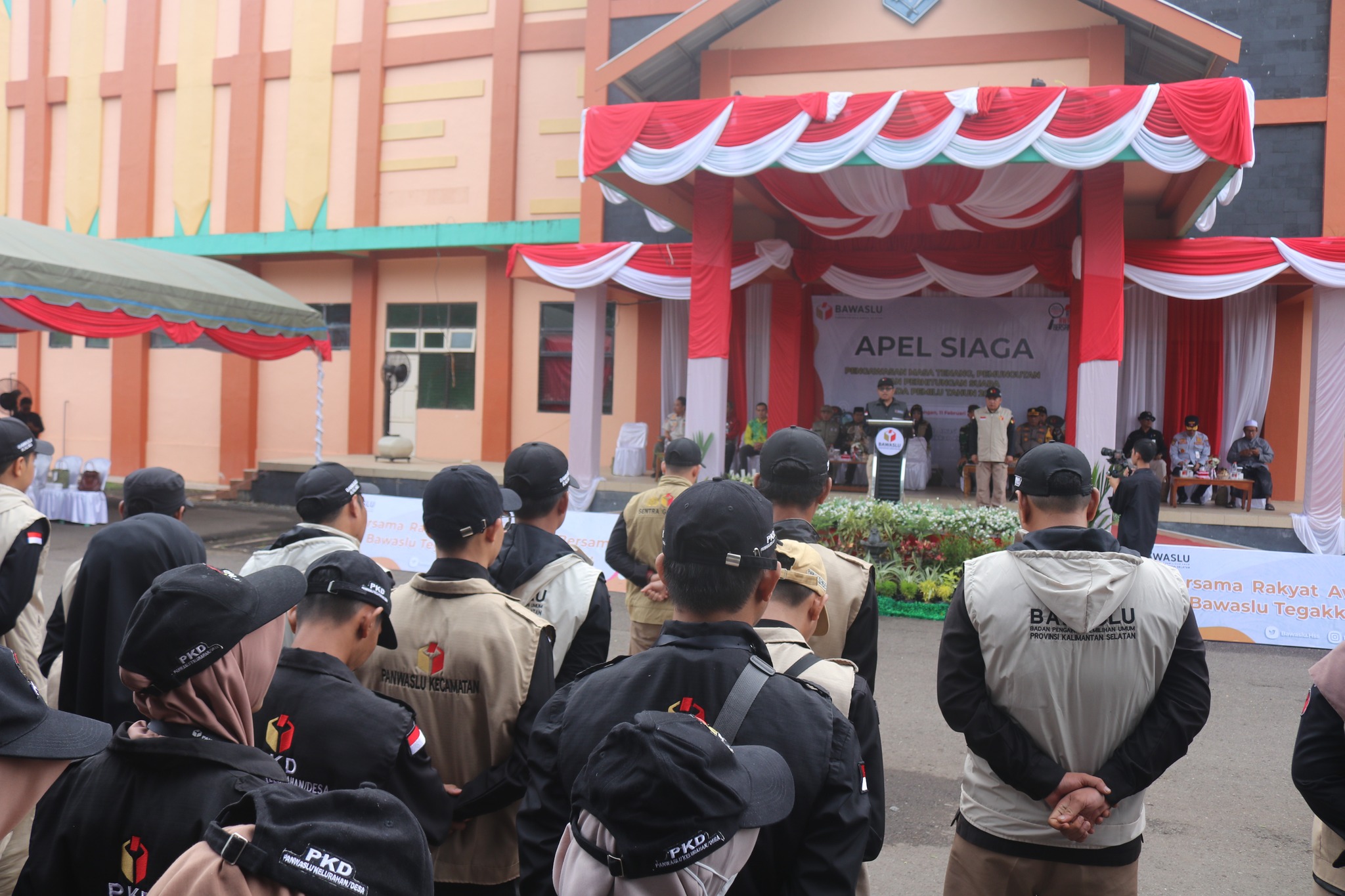 Bertindak selaku pembina apel Ketua Bawaslu Kab HSS Hasnan Fauzan, M.Pd.I dan melibatkan partisipasi aktif dari seluruh komponen penyelenggara pemilu, termasuk KPU, Bawaslu, Panwascam se-Kab HSS, Pengawas Kelurahan/Desa, dan pihak keamanan dari TNI, Polri, dan Satpol PP.