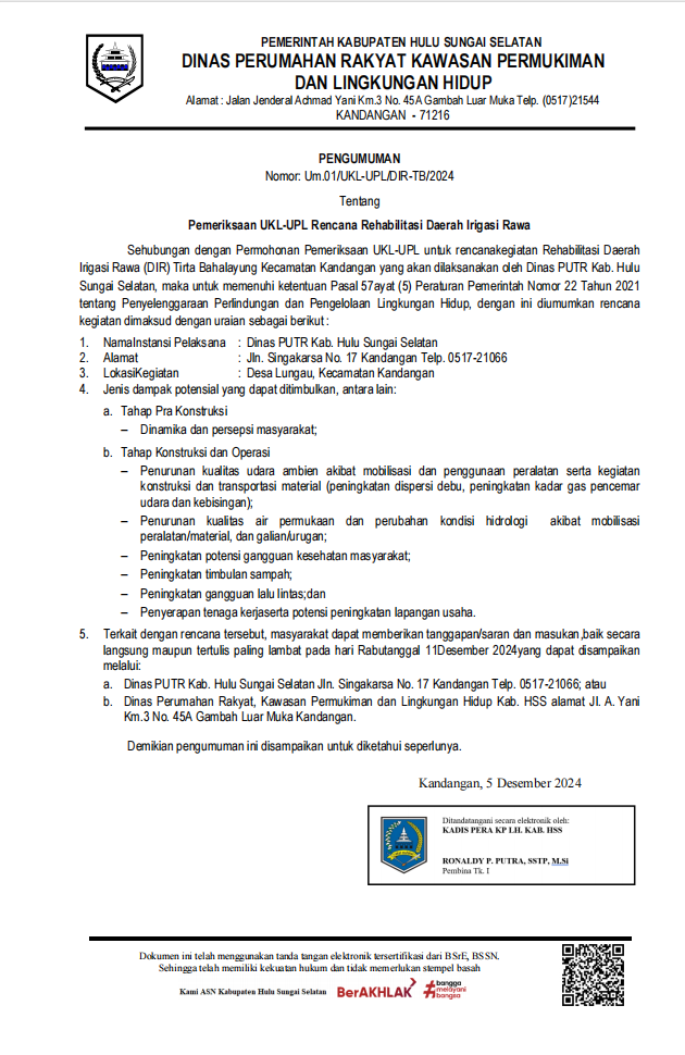 a. Dinas PUTR Kab. Hulu Sungai Selatan JIn: Singakarsa No. 17 Kandangan Telp. 0517-21066; atau
