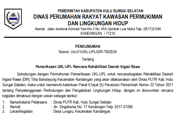 b. Dinas Perumahan Rakyat, Kawasan Permukiman dan Lingkungan Hidup Kab. HSS alamat JI. A. Yani Km.3 No.45A Gambah Luar Muka Kandangan.