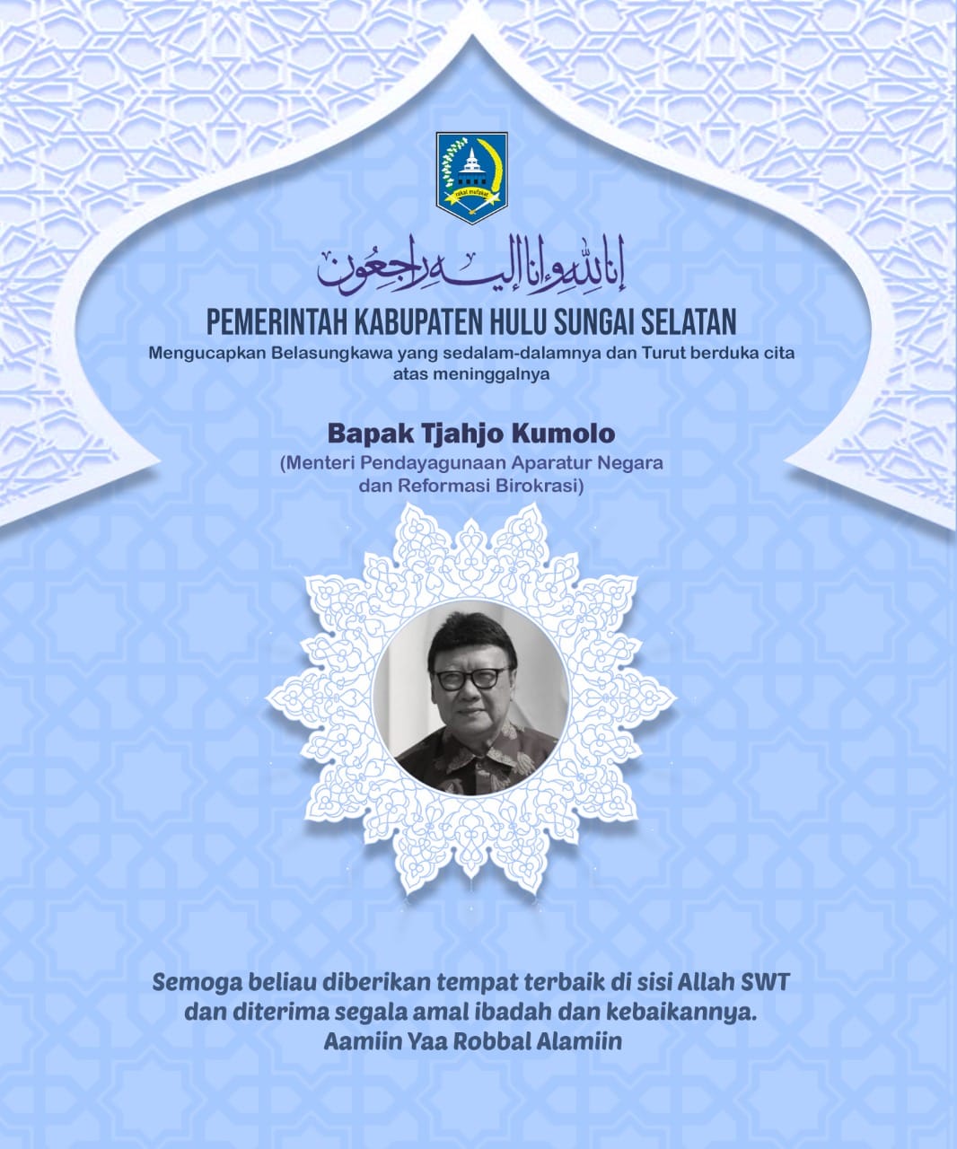 Pemerintah Kabupaten Hulu Sungai Selatan mengucapkan Belasungkawa yang sedalam-dalamnya atas meninggalnya Bapak Tjahjo Kumolo ( Menteri Pendayagunaan Aparatur Negara dan Reformasi Birokrasi )