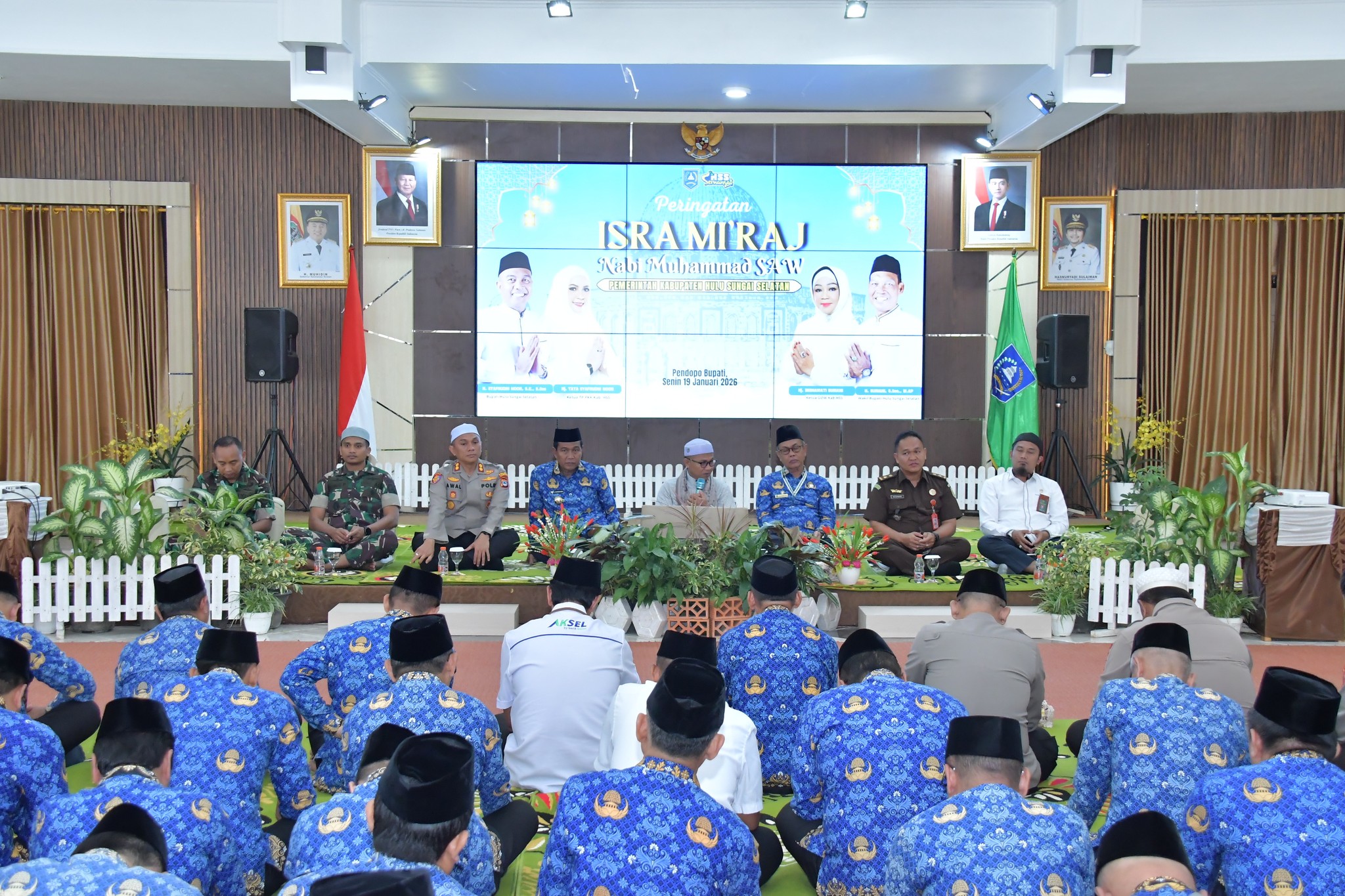 Pemerintah Kabupaten Hulu Sungai Selatan (HSS) menggelar peringatan Isra Mi’raj Nabi Muhammad SAW tahun 1447 H / 2026 M dengan penuh khidmat. Bertempat di Pendopo Bupati HSS pada Senin siang(19/01/2026), acara ini menjadi momentum penguatan spiritual bagi jajaran aparatur sipil negara di Bumi Rakat Mufakat. Acara ini dihadiri langsung oleh Bupati HSS, H. Syafrudin Noor, SE, S.Sos dan Wakil Bupati H. Suriani, S.Sos, M.AP. Turut hadir mendampingi unsur Forkopimda yang terdiri dari Kapolres HSS, Dandim 1003/HSS, Ketua PN Kandangan, dan Kajari HSS. Hadir pula Sekretaris Daerah Kabupaten HSS, Drs. H. Muhammad Noor, M.AP.