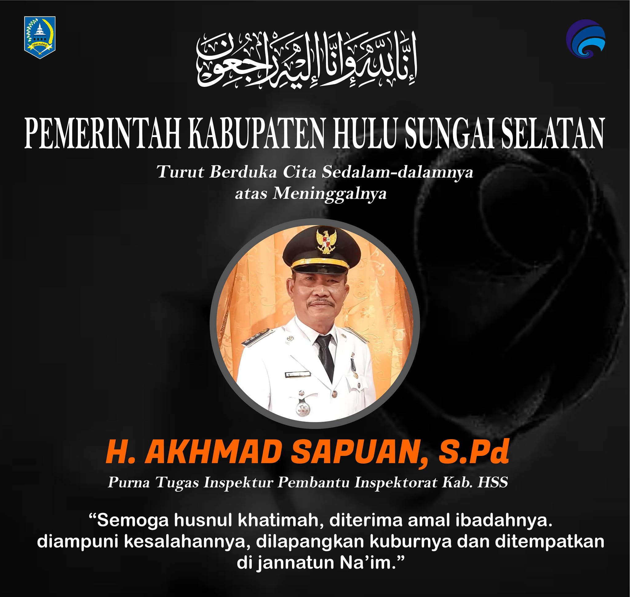PEMKAB HSS TURUT BERDUKA CITA SEDALAM-DALAMNYA ATAS MENINGGALNYA H. AKHMAD SAPUAN, S.Pd (PURNA TUGAS INSPEKTUR PEMBANTU INSPEKTORAT KAB. HSS) SEMOGA ALMARHUM HUSNUL KHATIMAH AAMIIN YAA RABBAL’ALAMIIN..