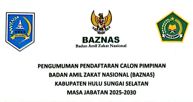 Pemerintah Kabupaten Hulu Sungai Selatan membuka pendaftaran Calon Pimpinan Badan Amil Zakat Nasional (BAZNAS) untuk masa jabatan 2025–2030. Pendaftaran dibuka mulai 26 Juni hingga 21 Agustus 2025, pada hari kerja pukul 09.00–16.00 WITA.