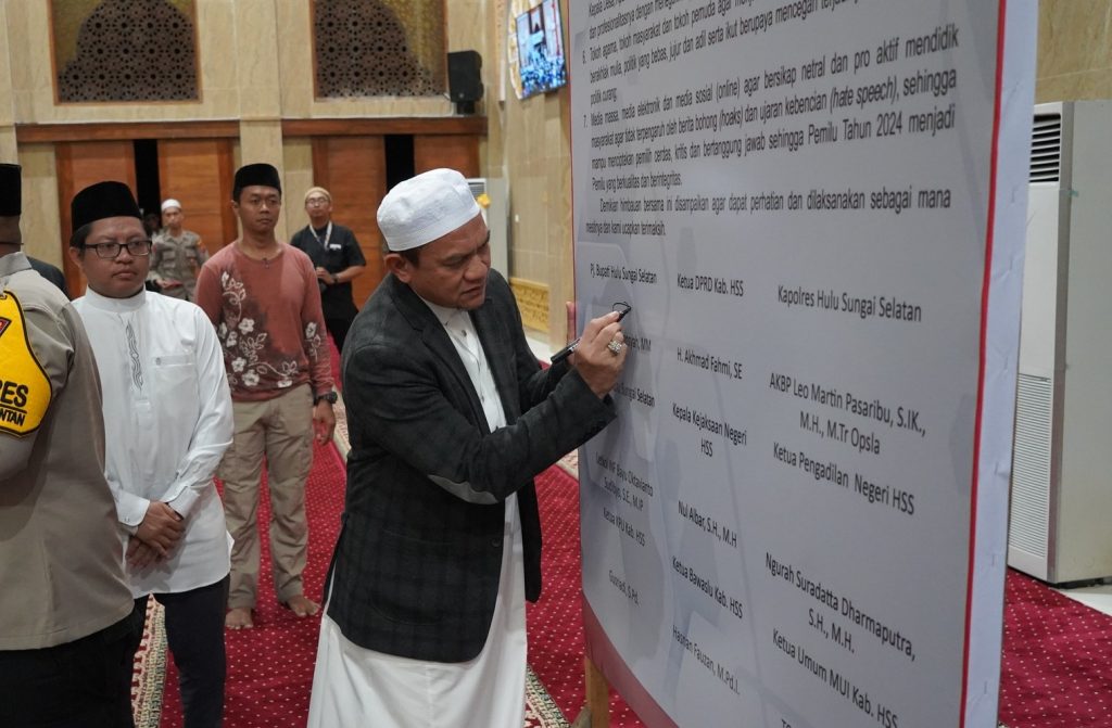 Pada kesempatan tersebut, Penjabat Bupati Drs. H. Hermansyah, MM dan Forkopimda menandatangani himbauan bersama yang menekankan pentingnya menjaga perdamaian dan ketertiban selama proses penyelenggaraan Pemilu 2024. Himbauan tersebut akan disosialisasikan kepada masyarakat sebagai komitmen bersama untuk menciptakan proses pemilihan yang adil dan berintegritas.