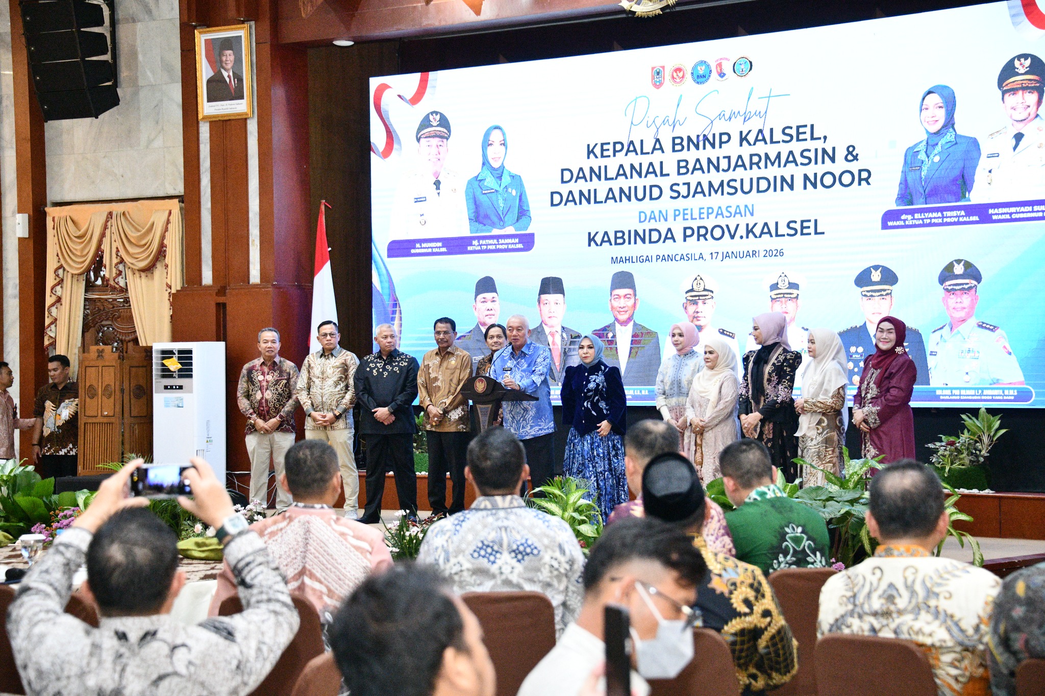 Bupati Hulu Sungai Selatan (HSS), H. Syafrudin Noor, SE., S.Sos., menghadiri acara Pisah Sambut Pimpinan Badan Narkotika Nasional, Pangkalan TNI Angkatan Laut Banjarmasin, Komandan Pangkalan TNI Angkatan Udara Syamsudin Noor, dan Badan Intelijen Negara Daerah Kalimantan Selatan di Pemerintah Provinsi Kalimantan Selatan yang digelar di Gedung Mahligai Pancasila, Banjarmasin, pada Sabtu (17/1). Kegiatan ini berlangsung dengan suasana khidmat, penuh penghormatan, serta sarat makna kebersamaan dan kesinambungan pengabdian. Turut mendampingi Kepala Bagian Protokol dan Komunikasi Pimpinan Setda HSS Ahmad Busairi , S.STP, M. M.