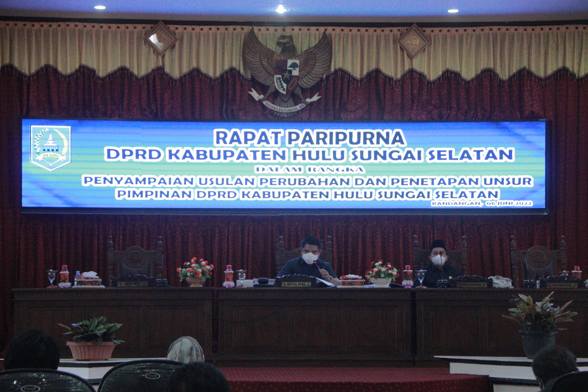 Setelah Rapat Paripuna Penyampaian Raperda Pertanggungjawaban APBD TA.2021, Dewan Perwakilan Rakyat Daerah (DPRD) Kabupaten Hulu Sungai Selatan (HSS) menggelar Rapat Paripurna Penyampaian Usulan dan Pengumuman serta Penetapan Perubahan Unsur Pimpinan yang dipimpin oleh Ketua DPRD Kab. HSS H. Akhmad Fahmi, SE, bertempat di Ruang Rapat Paripurna, lantai II Gedung DPRD Kab. HSS. Senin 6 Juni 2022.