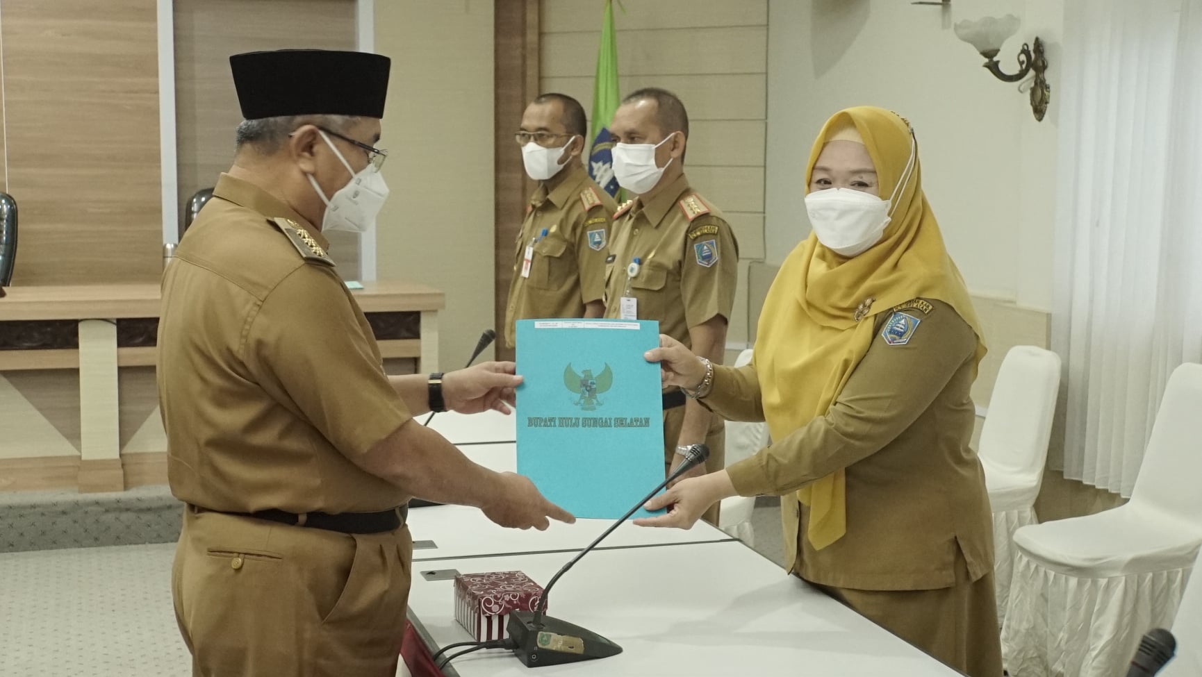 SK kenaikan pangkat diserahkan langsung oleh Bupati HSS Drs. H. Achmad Fikry M.AP didampingi Kepala BKPSDM Kab. HSS H. Zulkifli S.Sos M.AP kepada beberapa orang perwakilan ASN.