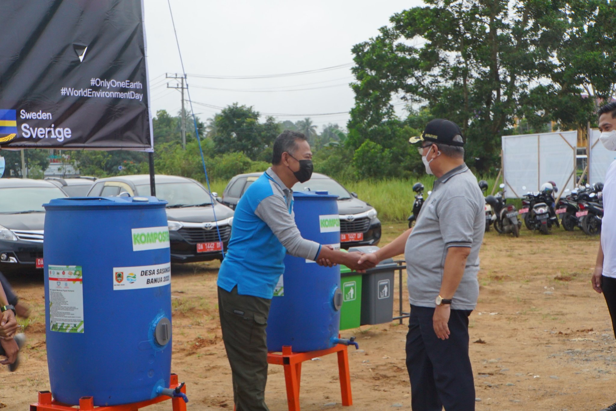 Sebelum menanam pohon, Bupati HSS Drs. H. Achmad Fikry, M.AP menyerahkan bantuan beberapa unit komposter dan tempat sampah kepada desa / kelurahan yang menjadi pilot project untuk isu lingkungan. Diantaranya Desa Durian Rabung, Desa Paharangan, dan Keluarahan Kandangan Barat.