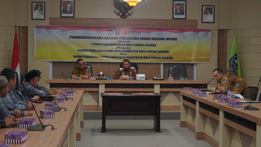 Bertempat di Aula Rakat Mufakat Pj. Bupati Hulu Sungai Selatan (HSS) Drs. H. Hermansyah,M.M, menyaksikan Penandatanganan Nota Perjanjian Hibah Daerah (NPHD) antara Pemerintah Daerah Kab. HSS dengan Komisi Pemilihan Umum (KPU) Kab. HSS dan Badan Pengawas Pemilu (Bawaslu) Kab. HSS untuk mendukung Pemilihan Umum dan Pemilihan Kepala Daerah (Pilkada) yang akan datang. Nota perjanjian ini memastikan bahwa Dana Hibah Daerah akan dialokasikan untuk kelancaran dan transparansi pemilihan umum di Kab.HSS. Selasa (24/10/2023).