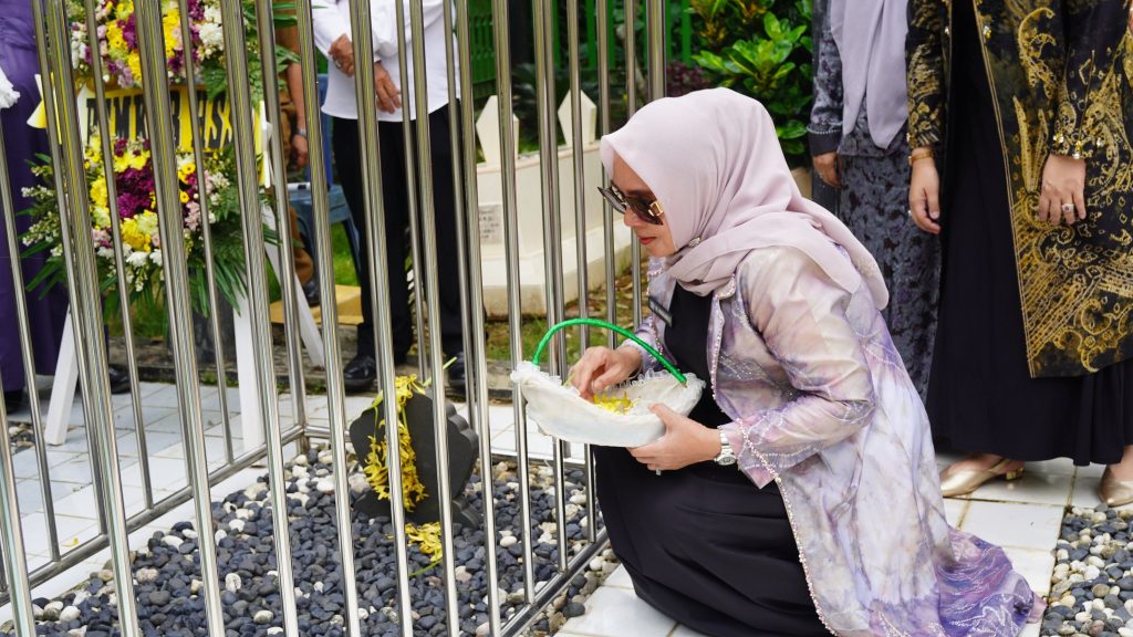 Pj. Ketua TP. PKK Kab. HSS Hj. Rusnawati Hermansyah turut menabur bunga di makam serta memberikan bingkisan kepada para keluarga almarhum mantan Bupati terdahulu.