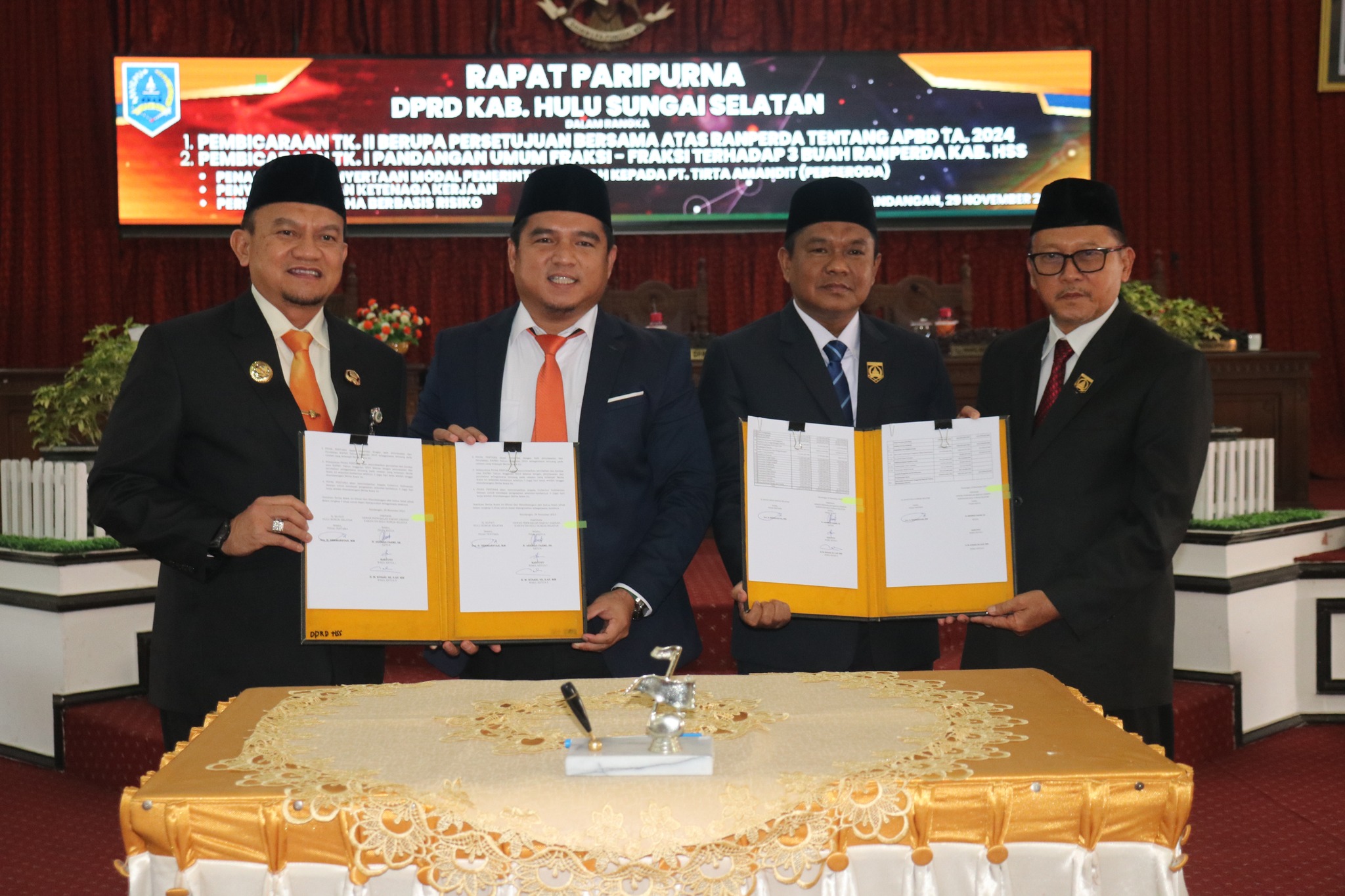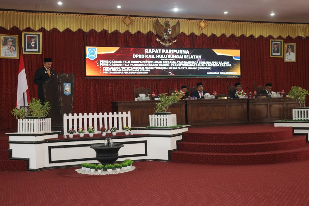 Pagi ini Dewan Perwakilan Rakyat Daerah (DPRD)Kabupaten Hulu Sungai Selatan (HSS) telah sukses menggelar Rapat Paripurna yang membahas dan menghasilkan persetujuan tentang Anggaran Pendapatan & Belanja Daerah (APBD) HSS Tahun 2024. Rapat Paripurna yang dipimpin langsung oleh Ketua DPRD H. Ahmad Fahmi, SE ini dihadiri langsung dari pihak eksekutif oleh Penjabat Bupati HSS, Drs. H. Hermansyah, MM beserta unsur Forkopimda lengkap yang berlangsung di ruang utama DPRD, lantai 2. Turut hadir Plh. Sekda dan para Kepala OPD. (Rabu, 29/11).