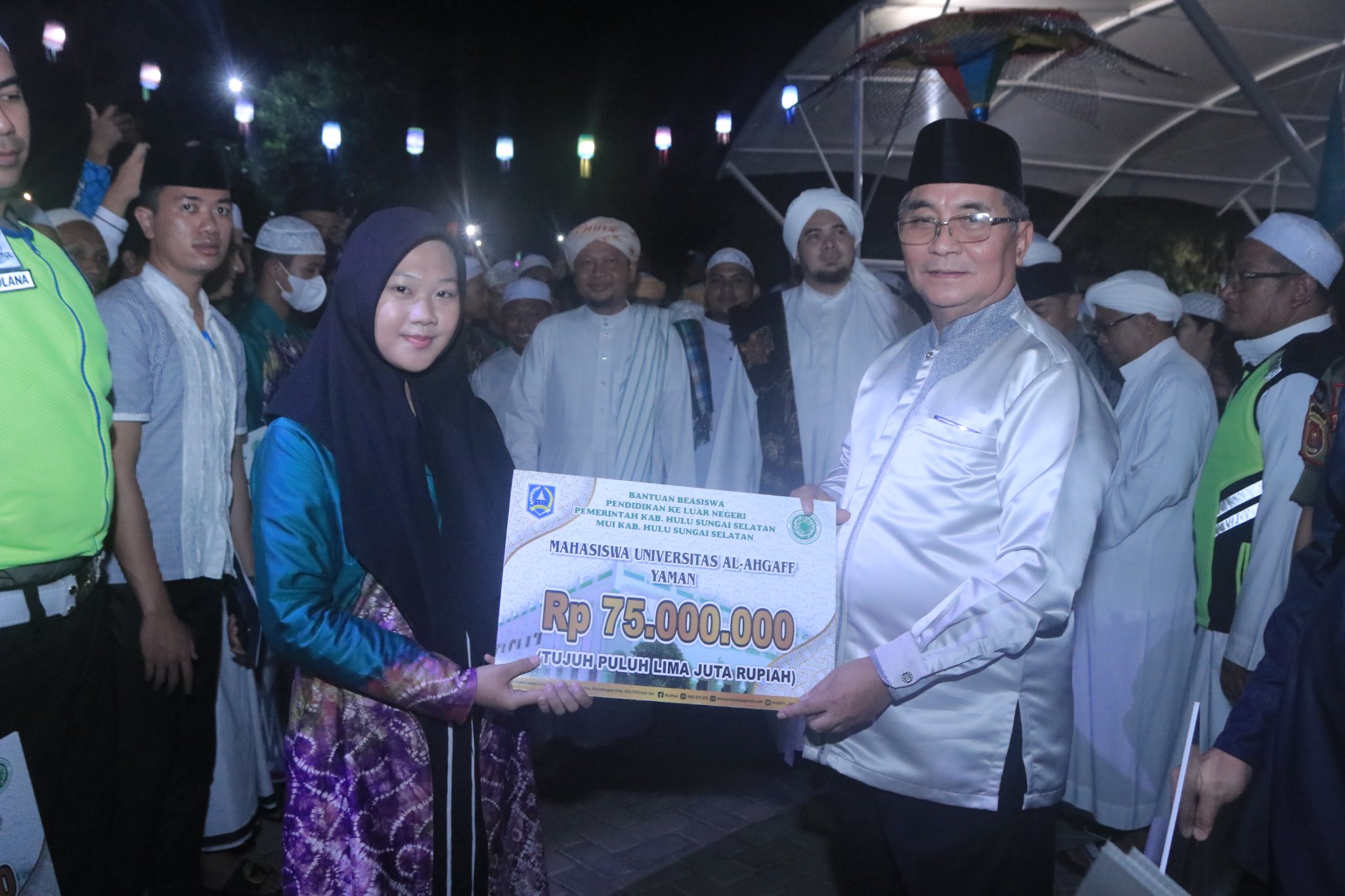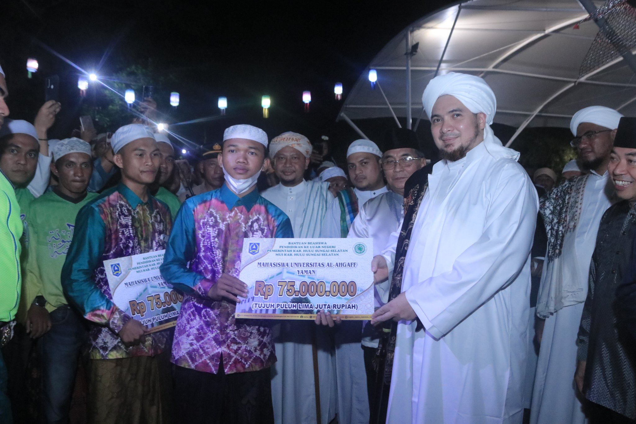 Sebelum acara dimulai, Al Habib Jindan Bin Novel bersama dengan TGH. Ahmad Syairazi dan Bupati HSS Drs. H. Achmad Fikry, M.AP serta Wakil Bupati HSS Syamsuri Arsyad, S.AP, MA menyerahkan bantuan beasiswa pendidikan ke luar negeri Pemerintah Kab. Hulu Sungai Selatan dan MUI Kabupaten HSS kepada para penerima.