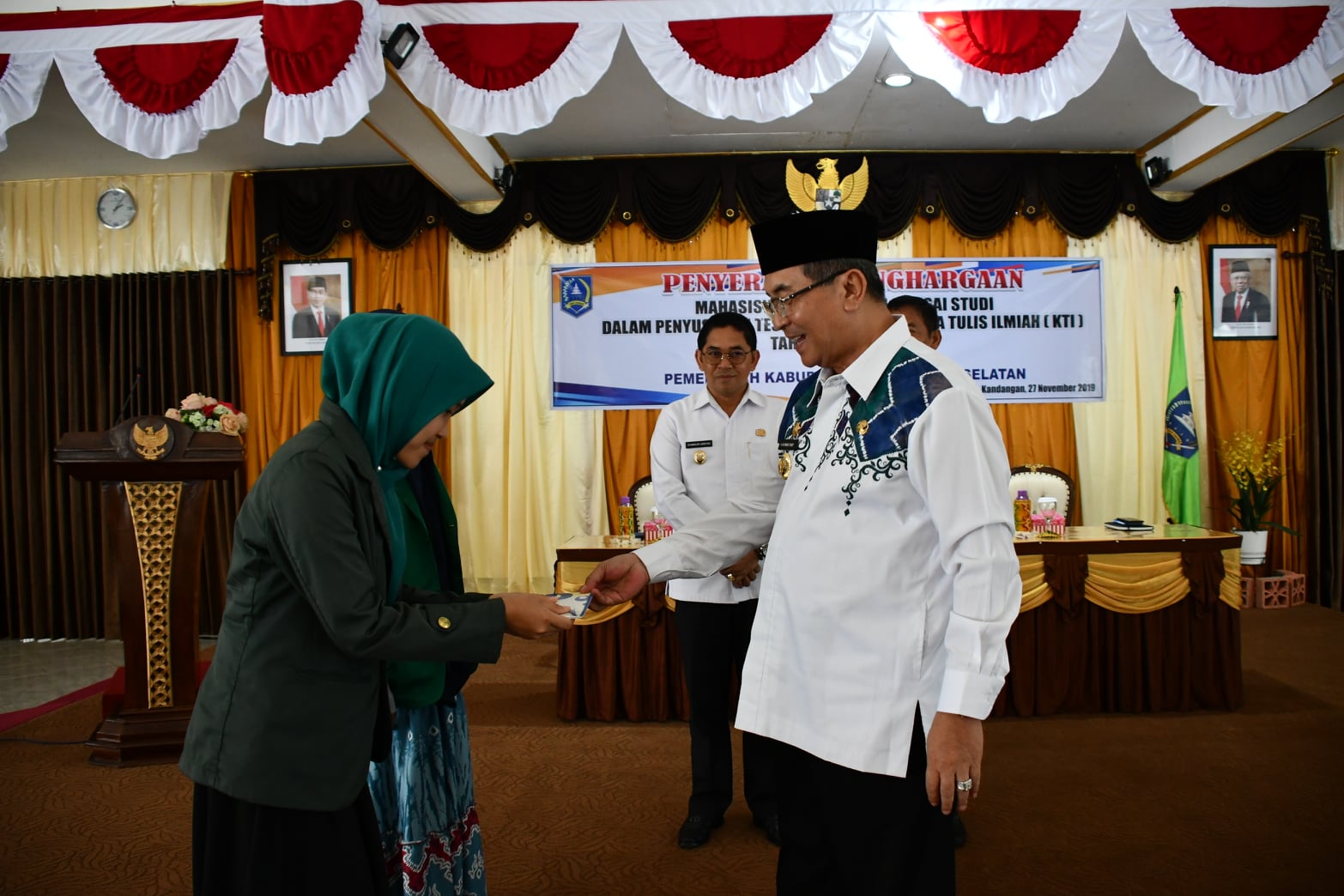 Bupati HSS Menyerahkan Penghargaan atas penyelesaian Tesis, Skripsi dan Karya Tulis Ilmiah bagi Ratusan mahasiswa dari Kabupaten Hulu Sungai Selatan (HSS). Apresiasi yang diberikan oleh Pemkab HSS kepada ratusan mahasiswa itu berupa penghargaan dan dana pembinaan. Penyerahan penghargaan tahap II Tahun 2019 kepada mahasiswa HSS dilaksanakan diPendopo Kabupaten HSS. Rabu (27/11/2019)