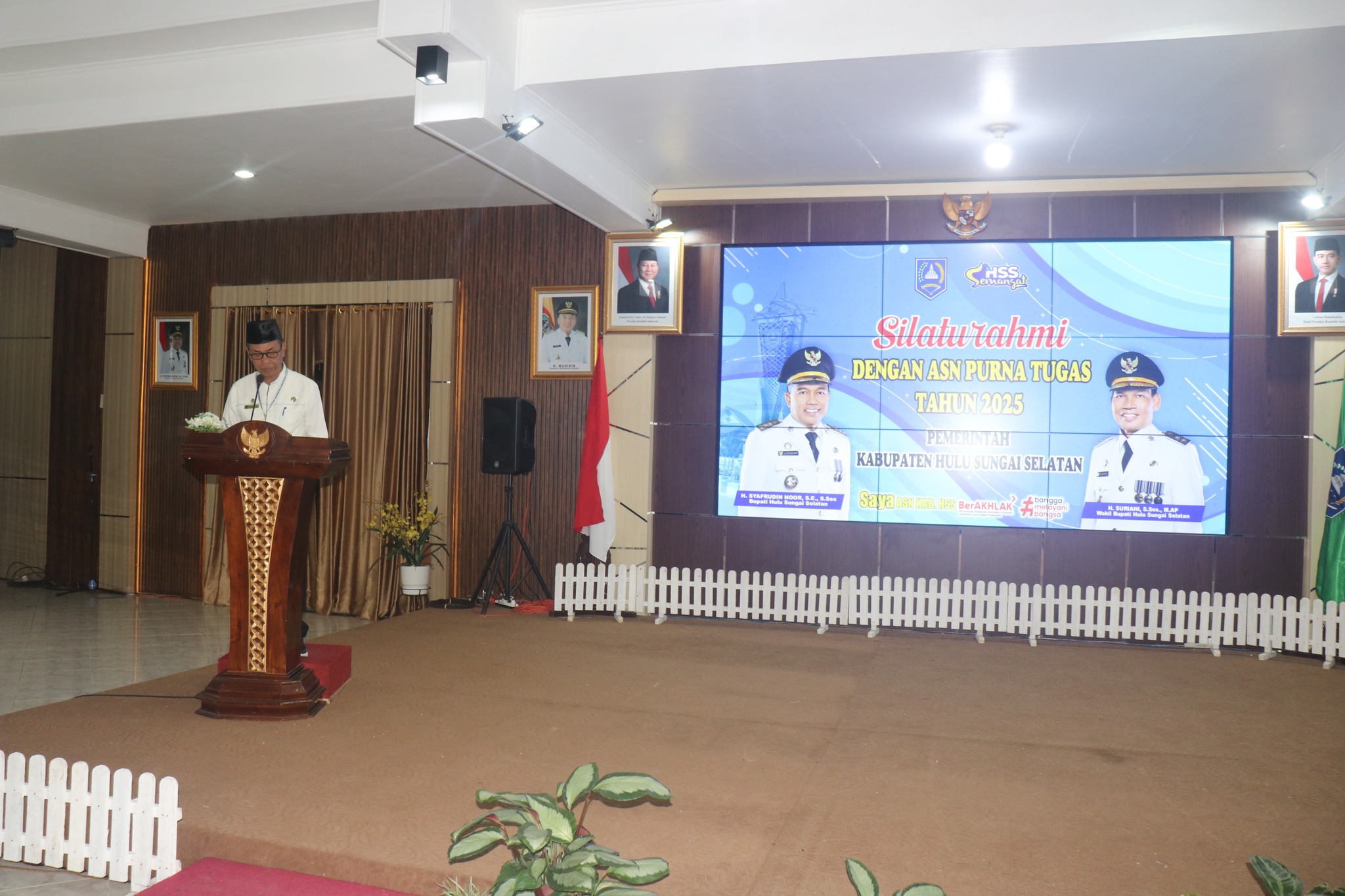 Sekretaris Daerah Kabupaten Hulu Sungai Selatan (HSS), Drs. H. Muhammad Noor, M.AP., didampingi Ketua Dharma Wanita Persatuan (DWP) Kabupaten HSS, Ir. Hj. Elyani Yustika M. Noor, menghadiri kegiatan Silaturahmi dan Penyerahan Cinderamata/Tali Asih bagi ASN Purna Tugas Tahun 2025. Kegiatan tersebut berlangsung di Pendopo Bupati Hulu Sungai Selatan, Jumat (19/12/2025).