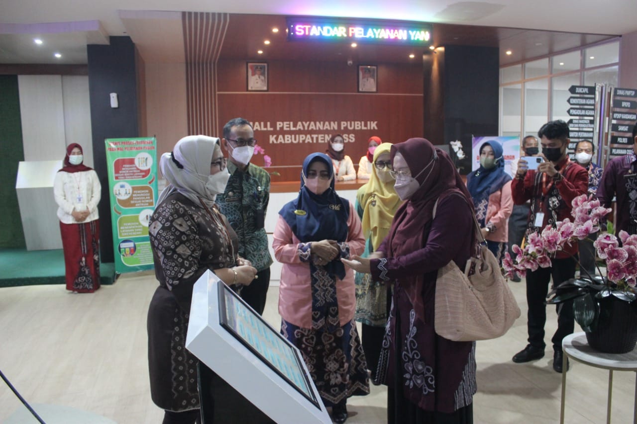 Sekretaris Daerah Kab. HSS Drs. H. Muhammad Noor didampingi Kepala Dinas Penanaman Modal dan Pelayanan Satu Pintu (PMPTSP) Kabupaten Hulu Sungai Selatan Hj. Yustika Elyani menerima kunjungan Asisten Deputi Standarisasi Pelayanan Publik dan Pelayanan Inklusif Kementerian Pendayagunaan Aparatur Negara dan Reformasi Birokrasi Noviana Andrina, S.H., M.AP di Mal Pelayanan Publik HSS, Kamis (14/4/2022).