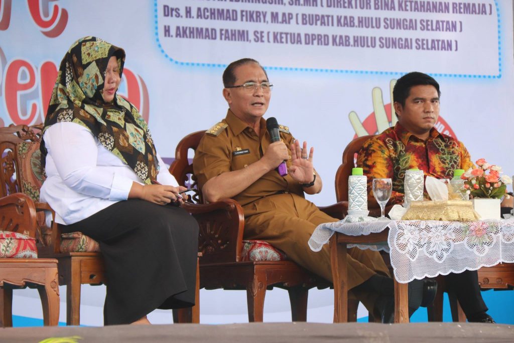 Bupati H.Achmad Fikry selaku salah satu narasumber dalam arahannya menyampaikan pesannya kepada para peserta, bahwa Pemkab HSS sangat peduli dengan masalah perkawinan usia dini, bahkan telah menerbitkan perbup khusus untuk masalah ini. “Jangan sampai remaja kita menjadi dipaksa untuk dewasa sebelum waktunya. Kenyataan yang terjadi di lapangan, pernikahan usia dini juga disebabkan faktor orang tua yang justru kebelet ingin mengawinkan anaknya” tegasnya.